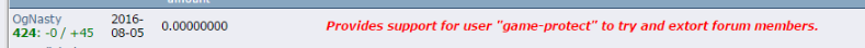 I'm going to paint your other account red with negative feedback if you don't remove this. Thought I'd give you the chance to do the right thing first. Here's the negative feedback I'll be returning to you tomorrow if you do not remove the unwarranted negative feedback immediately. I will be more harsh to alt accounts I discover linked to this account, as well as alerting the scam patrol and moderator staff to do the same. Please do the right thing and save us both the time and negative energy. Quote Leaving negative feedback because of who purchased my advertising? Clearly this unstable individual and his service should be avoided.[/color][/b][/size] What other account ??? I'm not going to dignify you with any further discussion. Tomorrow I will leave you negative feedback if you do not do the right thing. If you send me any other message besides apologize for leaving me negative trust because I fulfilled the promise of my signature auction then I will set your account to ignore. I'm not going to play games with you.. Good luck. Seek help for your gambling addiction. Nobody is to blame for your current situation but yourself.You do realize that is the forum's policy, right? If you were to remove your negative trust, I can put in a policy that companies with negative trust can no longer bid on my signature advertising slot. This would mean I would no longer be advertising for betcoin.ag (or similar untrusted organizations) at the end of this month. That is the best I can do without breaking the contract I have in place, and is a final attempt at compromise to end this feud with you. Games-Protect does not remove his OgNasty negative feedback and...