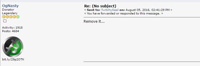 A conflict which I never intended to, and one which I did everything remotely possible to avoid, but frankly, no matter how hard I tried, it failed. Taking things out in public isn't normally my way, but hands down, I tried sorting this out, over and over again, and this is the last option I see for myself. Everything began a few days ago, when out of the blue I was contacted by OgNasty about their current struggles with TwitchySeal/game-protect/et al. Their messages included vague threats in my direction ("I am disappointed with you and while I move slowly, I cut deep."), aswell as a lot of stuff that did not make sense to me. I was shocked and confused, it seemed like a big misunderstanding to me. A full transcript of the first night can be found here -> https://i.snag.gy/ro4AOi.jpg (This is 100% authentic information, which can be confirmed by trusted members.) I immediately contacted a few guys to try help me putting any sense to it and consulted several members of staff about this, as I wanted to know what exactly was going down. None had any idea about what was happening or what exactly OgNasty was talking about. As time passed by, I realized that OgNasty believes I'm the person in control of the accounts TwitchySeal, game-protect, aswell as some others. A believe which is not only wrong, but also backed up by no evidence whatsoever. Theymos came in on the situation. They can confirm that there are no IP evidences connecting me to either of these accounts and that there's no further reason to believe I am connected to any of them in any given way. Meanwhile, OgNasty was looking into ways to release my address on the forum. An address they got for shipping purposes (I've ordered coins a few time from them) and further, an address that has nothing to do on this forum or in public in general. I'm shocked they even tried getting the allowance to do so. To me, that's been a major brech of trust I gave them when trading with them. Further, one night, without me around, they've had the following conversation in the #cryptocurrency-collectors channel (FreeNode/Slack), which started with the words "<ognasty> @lutpin: Really should kill himself." Code: <Slck><ognasty> @lutpin: Really should kill himself. As to this day, even with theymos trying to get a hand on the situation, nothing has changed to the better, I feel no other way than going public with this situation. This has been going on for too long, it's starting to affect my health. I want nothing else than this to stop, I had nothing to do with the people harassing you. It has to stop, right now and right here. Title: Re: OgNasty: "@Lutpin: Really should kill himself." Post by: Lauda on August 18, 2016, 10:18:02 PM I've posted here to watch how the situation unfolds/resolves.