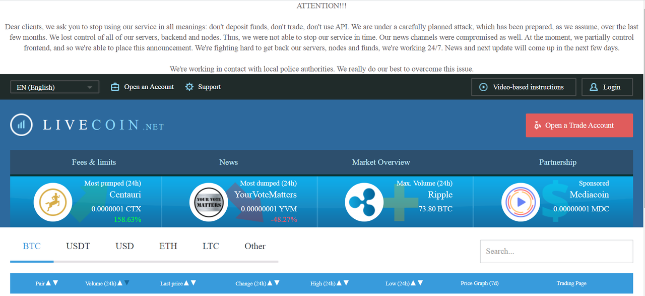 Title: Re: Livecoin.net exchange is a SCAM Post by: TastyChillySauce00 on December 27, 2020, 06:42:37 AM What is going on with Livecoin? Livecoin went and it will never go back again. So many users from livecoin already accused this one already become exit scam project. it looks like the team was arguing their exchange site getting hacked caused by they wanna steal the funds, the investors must have taken the legal action against the owner of livecoin.Withdrawals suspended for most coins. Prices of coins trading up to 700% the real price BTC trading at 249000 USD https://archive.is/29YXa Title: Re: Livecoin.net exchange is a SCAM Post by: Mkmanik on December 27, 2020, 08:56:10 AM after a long time today, I tried to visit Livecoin exchange but at the interface, it's asking for ATTENTION! They are asking to stop using their service in all meanings. also, they are discouraged to do deposits and trade. I am sharing the photo for a better understanding :