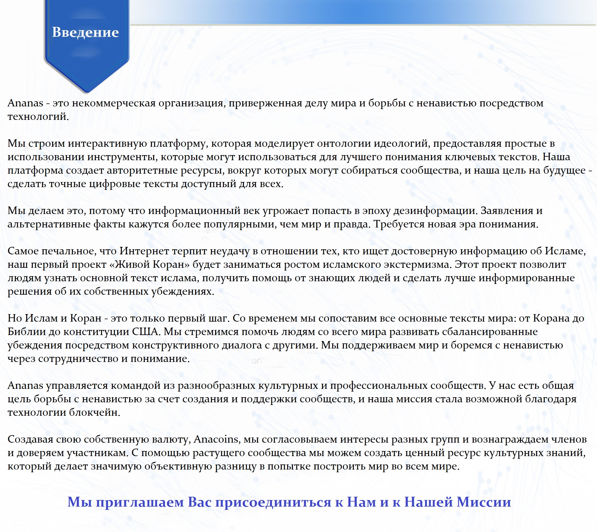 Я думаю разработчикам нужно было обратится к разным организациям для популяризации Корана, а не искать деньги на это среди крипты. Да и название АНАНАС фонд который будет популяризировать Коран и построит децентрализованную всемирную базу знаний звучит немного... Title: Re: [ANN] ANACOIN - Криптовалюта для мира Post by: HappyLov on September 29, 2017, 11:44:19 AM Проекты с позитивными названиями пошли Мандарин, Ананас, вот только тема за ананасом очень серьезная скрывается от Корана Библии до конституции США, вы имеете в виду, что на платформе будут раскрываться никому не доступные до сегодняшнего времени исторические факторы во всем мире?, а не только расширенное изучение Корана и Библии?
