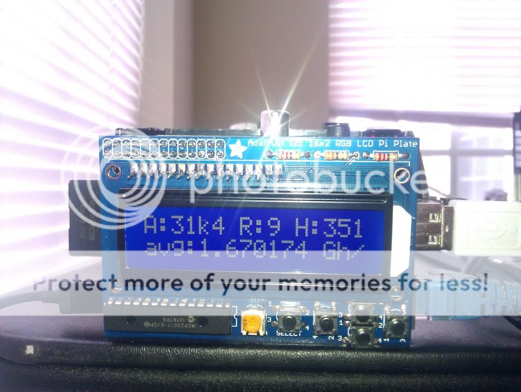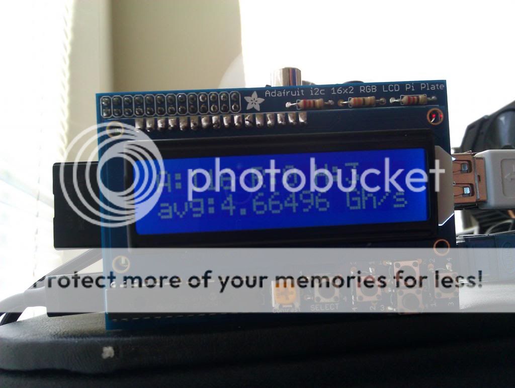 Sadly, my screen now just says 'MHS av' 'MHS av' Im guessing CGminer changes its API or something from the 2 versions. All the other functions still work such as miner & pool name, bitcoin price, network difficulty and the devices screen, just not the most important one showing the hashing rate and the Accepted, Rejected, HW Error stats on the first screen. I don't really know Python, but I understand that the "fault" lies with the PiMinerInfo.py file (https://github.com/adafruit/PiMiner/blob/master/PiMinerInfo.py) Wonder if maybe the project author, or some other kind person could assist. Perhaps its worth creating an updated version of the tutorial, it seems as though its been hugely successful, tons of people use RPI's as mining controllers, just would be nice for it to work with the newer CGminer versions and seeing as block eruptors are getting more and more obsolete, maybe its time! Would be a shame for me to have no use for the adafruit screen, that tutorial was the only reason I purchased the LCD plate! Title: Re: PiMiner - DIY mining controller/monitor with Raspberry Pi [v1.1] Post by: chadgroover on January 06, 2014, 05:01:52 PM Another guy here who bought an Adafruit 16x2 display on the basis of how cool it looked in the article!
