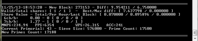 <Up arrow key> - Increment Prime Count by 1 <Down arrow key> - Decrement Prime Count by 1 <Left arrow key> - Decrement Prime Count by 1000 <Right arrow key> - Increment Prime Count by 1000 <S> - Print current settings <R> - Reset all statistics <T> - Enable/Disable Auto tuning <[> - Decrement Primorial Multiplier <]> - Increment Primorial Multiplier <-> - Decrement Sieve size <+> - Increment Sieve size И еще хотел спросить, как можно посмотреть всю статистику своего солопула? Возможно ли это? И где вы смотрите логи клиента? Вот так у меня показывает, все верно? http://www.freeimagehosting.net/newuploads/i35w2.png Title: Re: [XPM] [ANN] Primecoin Post by: qqqq on January 25, 2014, 07:26:49 AM Это че получается первая же шара была "блочная" )) ? А где же 6ch 7ch 8ch и т д, кстати сколько майнер работал до этой шары? Орфан это когда нашел ты шару "нужной" сложности и какой-то чувак в это же время (пока еще не нашел кто-то следующий блок), но цепочка подтвердилась следующим блоком первая у него, а не у тебя. От его кошелька же тоже инфу о найденом им блоке получают люди, но совсем другие, нежели от твоего. Тут просто все зависит от везения, ничего не поделаешь. Я майнил соло, а не на пуле, потому и 6ch,7ch и т.д. шары нафик не нужны (на пулах они нужны для распределения куша среди участников). Если заметил, наверху есть такое: Diff: 10.437680 / 10.437680 (на пулах обычно Diff: 10.437680 / 7 ), то есть учитывается сложность не меньше нынешней сложности сети. тогда как при пулах оно обычно от 7-и и выше(указывается пулом). Майнер проработал около трое суток чтобы найти шару, сейчас вот опять прошло почти трое суток, жду чтоб капнуло :) Ну про орфанед я так и написал, то есть с этим разобрались, также и с фактом что в моём случае это был не орфанед. Не знаю что у тебя за майнер, но мой в соло показывает все шары включая наименьшие (полнятно что для блока они не нужны но они должны быть в любом случае), значит какой-то косяк с майнером. Например вот http://s9.postimg.org/gy16u1sjz/image.jpg Баба Ванга предполагает что у тебя обычный майнер для пула, не модифицированный. Вполне допускаю что у меня не то (у меня пока всё в тестовом режиме). Каким майнером пользуешься? Дай ссыль. Надеюсь есть под линуксом, или хотя бы исходники. И какие настройки указываешь? У меня под винду, мод называется jhPrimeminer_RdBBeta4.0E3_x64 (кажется уже давно вышел обновленный, но что-то ссылки сложно стало найти на него, все похерилось с постов в шапке там где выкладывали), строка Code: jhPrimeMiner.exe -o 192.168.0.1:1234 -u 1234 -p 1234 -t 6 -s 2000000 http://speedy.sh/MnHuA/jhPrimeminer-RdBBeta4.0E3-x64.zip А выкладывали на дропбокс из шапки тут https://bitcointalk.org/index.php?topic=257623.0 Хм, а разве в соло, ты не должен указать кошелёк куда засылать монетки за найденный блок? То есть добавить в конце опцию -xpm , то есть чтобы получилось что-то вроде Quote jhprimeMiner -o 127.0.0.1 -u user -p password -xpm AVAG2RUySDd7vvJ96jN11JdkoZqXRawVpb -t 6 -s 2000000 Майнер которым майню походу содержит патчи RdB-ветки(jhprimeMiner от jrovins), так что думаю тут я на правильном пути. Лазил по форумам, народ вроде говорит что так и должно быть, как у меня, всё по нулям, и показывать только когда найден блок. Думаю тут уже зависит от разработчиков модов, кому как нравится чтобы было :)Ловил блоки (правда давно) и без указания адреса, сейчас среднее время нахождения блока около месяца для core i7 2600 (3.9 Ghz). Title: Re: [XPM] [ANN] Primecoin Post by: PhaNtomsss on January 25, 2014, 09:10:45 AM Ну короче настроил сеть из 10 компов на соло майнинг. На пуле они майнили 5 монет в сутки. Посмотрим, что будет в соло.