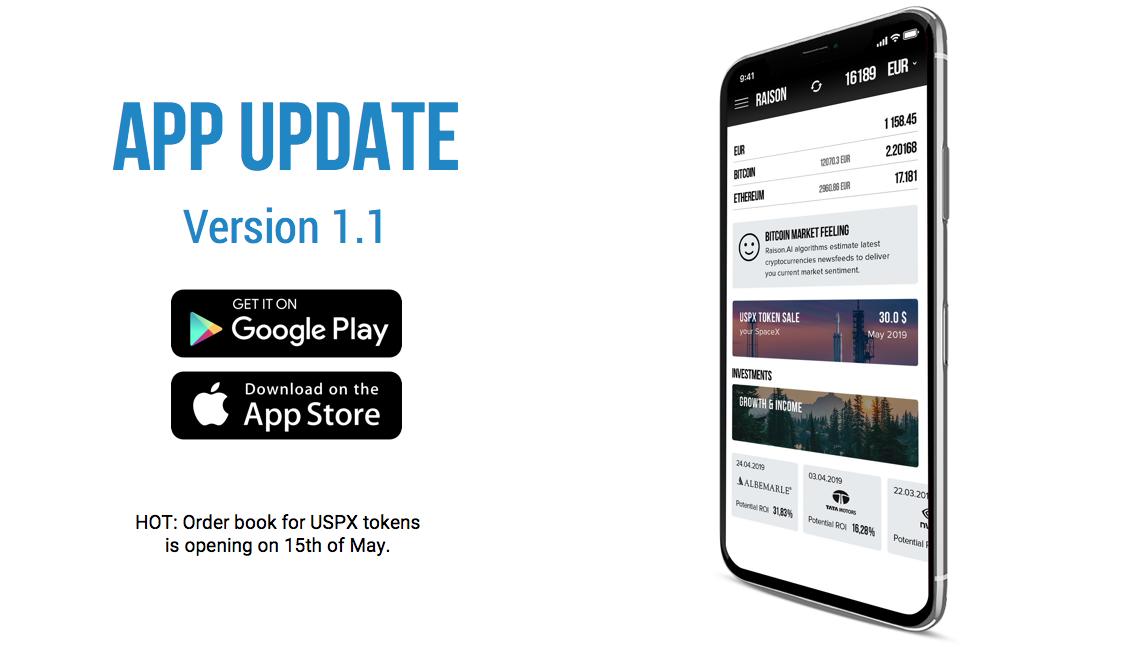 https://pbs.twimg.com/media/D59NQ6QX4AAAfXO.jpg Title: Re: [ANN] RAISON - AI INVESTMENT PLATFORM Post by: raisonai on July 18, 2019, 07:24:35 PM Dear friends. We are happy to announce that an official sale of USPX tokens is started on RAISON.AI.