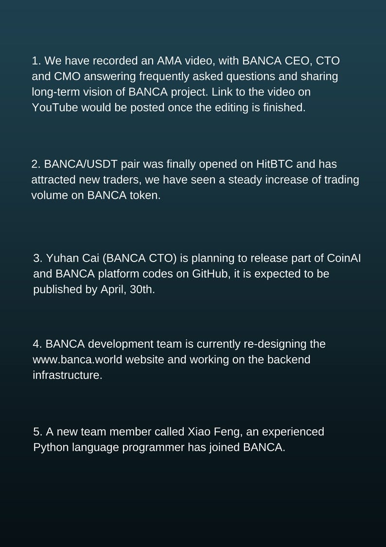 Title: Re: 💰[BOUNTY] Banca - The Wall Street on Blockchain💰 Post by: crevbi on April 13, 2018, 09:33:41 AM BANCA Weekly Update 13.04.2018