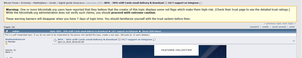Nobody can call them out and in this way their threads remain up for much longer. For example: Anyone offering giftcards with discounts greater than 5% is most definitely selling carded cards. This is highly illegal as it involves stealing other people's credit card information and is essentially money laundering. Those cards end up refunded, sometimes in the same day as well. So it's an activity that does no good to the world other than benefit the one that stole the credit card. Perhaps e-giftcard selling should be entirely banned on this forum. That's my opinion, some might find it draconian though. However, there's no way to tell legit from fake when it comes to e-giftcards and it'd be too resource intensive for mods to moderate every thread so a total ban makes sense to me. Also: cracked accounts go for sale All those accounts on subscription based services that go for sale for a fraction of their monthly subscription are obviously hacked into. They stay active for however long the original owner doesn't notice that someone else is in their account. But that process involves hacking and naturally, breach of personal information. Title: Re: Avoid auto-buy links, mainly locked or self moderated. Register before dealing Post by: gorgula on May 06, 2018, 10:24:28 PM Thanks for pinning this thread it saved me from some issues. I'm sure many noobs (me included) initially find the forum because of the marketplace. I am having trouble finding legit threads in the wake of this info, however.