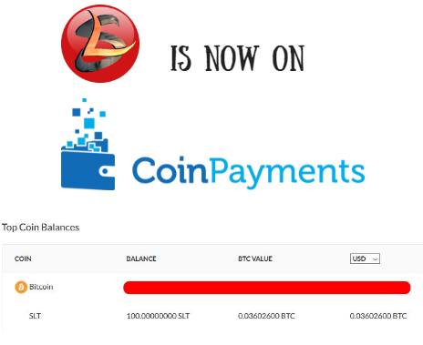 Title: Re: [ANN] SLT: Decentralized market [ICO] Post by: gniki on May 05, 2018, 10:22:50 PM SLT TOKEN IS NOW LISTED ON COINPAYMENTS ;)