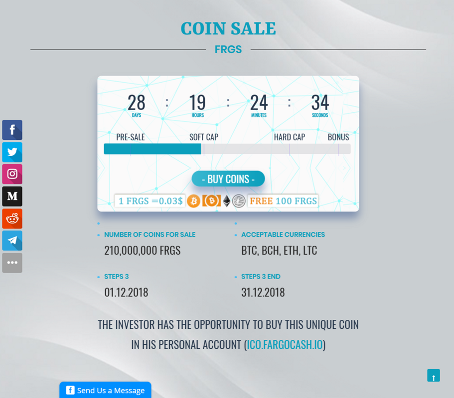 https://vk.com/fargocash (https://vk.com/fargocash) https://i.postimg.cc/cHnBbXh3/Screenshot-5.png (https://vk.com/fargocash) FargoCash (https://postimages.org/ru/) Title: Re: [BOUNTY]🌐FARGO CASH🌐ICO🌐MULTU-CRYPTO CURRENCY PLATFORM🌐 Post by: FargoCash on October 24, 2018, 10:00:45 PM At stage 3 of the sale of the coins was preserved these bonuses: