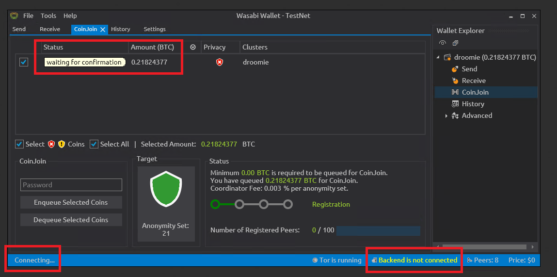 https://i.postimg.cc/zG6QzPK0/wasabi1.png Can i use coin join using tBtc?, I see 0 Btc required. When I am ready to use it?. Title: Re: Wasabi Wallet 1.0 Is Released Post by: Chikito on April 12, 2020, 11:26:27 AM Try to check Logs.txt in Wasabi directory (should be located on /path/to/your/user/.wasabiwallet) and see if there's anything useful. I don't use any anti virus. I see two log file TorLogs.tx and logs.txt, I am not sure which one. Also not connected into bitcoin node (off), don't have space to downloading block.Have you checked if there are any anti-virus/firewall which block your connection? Torlogs.txt Code: Apr 11 23:54:10.000 [notice] Bootstrapped 90% (ap_handshake_done): Handshake finished with a relay to build circuits Logs.txt Code: 2020-04-12 03:21:58 ERROR WasabiSynchronizer (306) WalletWasabi.Exceptions.TorSocks5FailureResponseException: Tor SOCKS5 proxy responded with TtlExpired. Title: Re: Wasabi Wallet 1.0 Is Released Post by: ABCbits on April 12, 2020, 12:35:41 PM The problem is related with Tor network, usually because you got bad circuit. There are 3 things you could do :