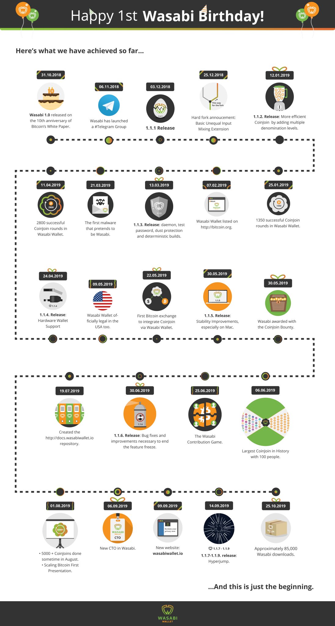 https://twitter.com/molnardavid84/status/1172420536447586306?s=21 Quote [RELEASE] Wasabi v1.1.8: Community Edition - Hotfix https://wasabiwallet.io With the v1.1.7 release, you could not spend funds if your wallet was created with an empty password. It is fixed in this hotfix. More details here: https://github.com/zkSNACKs/WalletWasabi/releases/tag/v1.1.8 https://pbs.twimg.com/card_img/1200438215418744834/TC7wF1Kg?format=jpg&name=600x314 Title: Re: Wasabi Wallet 1.0 Is Released Post by: layer1gfx on November 30, 2019, 04:14:49 AM just in case you missed this visual from the 1st birthday of wasabi wallet tweeted on the 31st october (https://twitter.com/wasabiwallet/status/1189903986872258562).