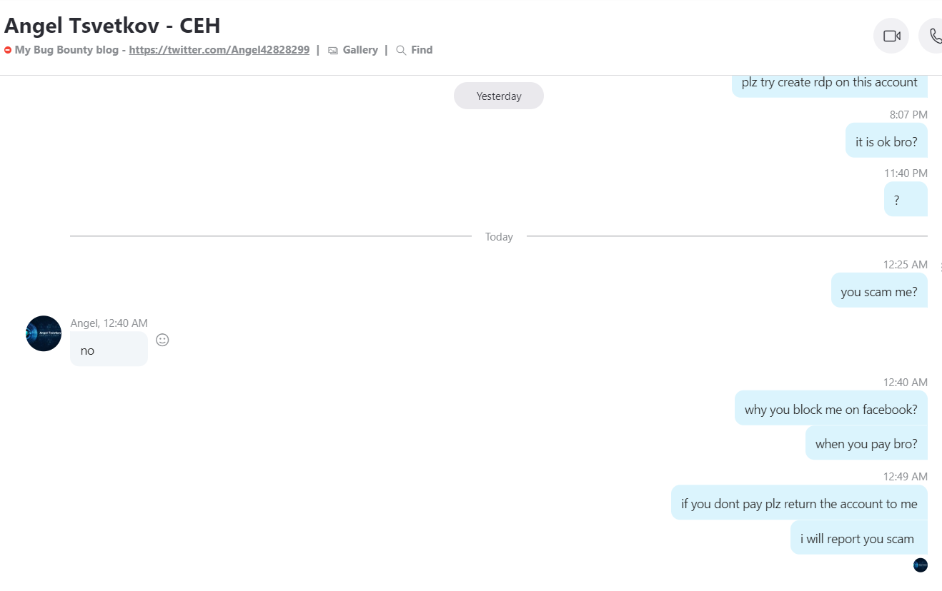 His Facebook profile: https://www.facebook.com/Angel.Leet.Leet His Skype: live:atsvetkov95 The link he sent me https://www.bbc.com/backstage/security-disclosure-policy/acknowledgements He said: "Click at my name: Angel Tsvetkov , at the BBC site, and you will be redirected to my facebook" https://2.bp.blogspot.com/-jnr2O3pIp2k/XNmv_DqQNxI/AAAAAAAAAKU/2lTfPWBA0uwv6TlbiP0hIK_ibqbZ-hXGwCLcBGAs/s1600/nga%2B2.png https://2.bp.blogspot.com/-XTYzFRlI_wU/XNmv_BYUD-I/AAAAAAAAAKY/GlLijX-KC70hdPUg91ejhze0zyK5G8BywCLcBGAs/s1600/nga%2B3.png https://4.bp.blogspot.com/-dir5GXdenVc/XNmv_H9qB7I/AAAAAAAAAKc/uOqY4Zyt4xgH-NETU1pJx8RpelLKXPGSgCLcBGAs/s1600/nga%2B4.png |