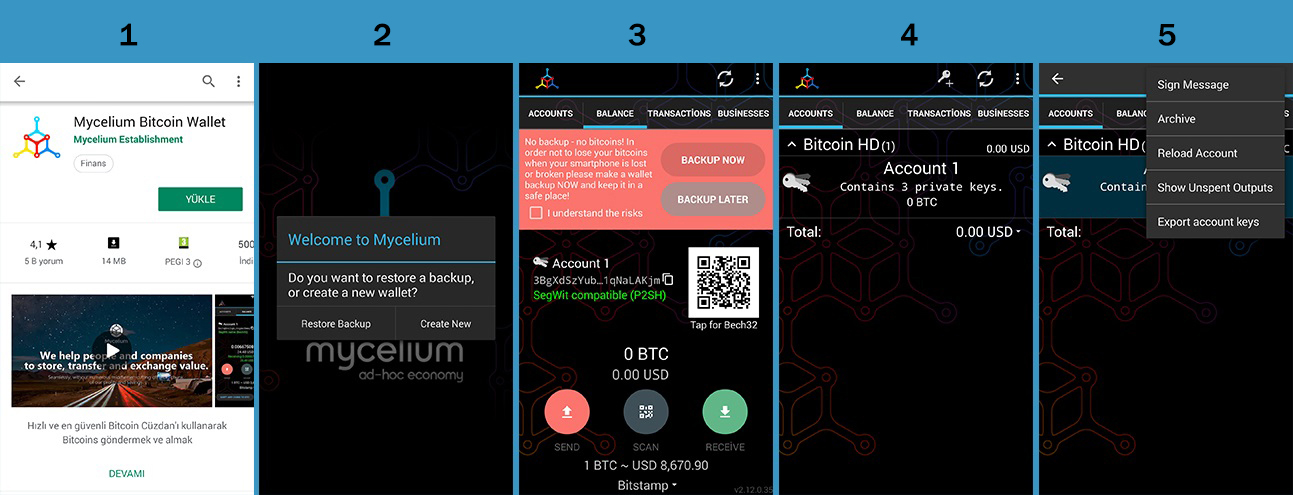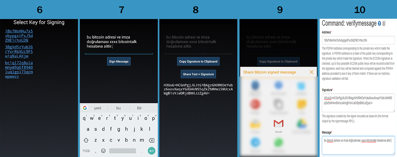 Bu konuda Bitcointalk hesaplarının Bitcoin adresi ile ilişkilendirilmesi ve olası hesap hackleri ya da şifre kaybetme durumları sonrası geri kazanılmasını sağlayan hesap imzalama işlemini anlatmaya çalışacağım. Lütfen eklemek istediklerinizi ya da yanlış olduğunu düşündüğünüz olası durumları konu altında belirtin. 1- https://bitcoin.org/tr/wallets/mobile/android/mycelium/ web adresi üzerinden android market uygulamasına gidin. 2- Elinizde seedleri bulunan bir cüzdan adresini imzalamak isterseniz "Restore Backup", yeni bir cüzdan oluşturmak isterseniz de "Create New" seçeneklerini tercih edin. Ben yeni bir cüzdan oluşturduğum için "Create New" seçtim. 3- Olası herhangi bir olumsuz duruma istinaden cüzdana her koşulda erişim sağlayabilmek için, seedleri yedekleme işlemini "Backup Now" seçeneğinden başlatın ve onları yedekleyin. Seedleri yedekleme işlemi sonunda uygulamaya pin kontrolü ekleyerek güvenliği artırabilirsiniz. 4- Ekranı bir adım sola kaydırarak "Balance" sayfasından "Account" sayfasına geçin. 5- "Account 1" ile otomatik olarak isimlendirilmiş kısma bir kez dokunun ve sağ üstteki üç nokta ile belirtilmiş menüyü açıp "Sign Message" seçeneğini işaretleyin. 6- 1 ile başlayan (Legacy) cüzdanı seçin. 1 ile başlayan cüzdanı seçme sebebinin açıklamasını buradan (https://bitcointalk.org/index.php?topic=5155790.msg51514655#msg51514655) konu altındaki 2. mesajda görebilirsiniz. 7- Bitcointalk hesabınız ile ilişkilendirilmiş olan Bitcoin cüzdan adresinizi, "konuya uygun ve hesap-cüzdan temasında" bir mesaj olarak "Sign Message" seçeneği ile imzalayın. 8- "Share Text + Signature" seçeneği ile imzayı paylaşmak için seçenekleri açın. 9- Herhangi bir yol ile paylaşımı gerçekleştirin ve bitcoin adresinin size ait olduğunu ispat eden imza-mesaj kombinasyonunuzu elde edin. 10- http://chainquery.com/bitcoin-api/verifymessage web aderesi üzerinden, imza ve mesaj içerik kombinasyonunuzun BTC adresinizle oluşan doğruluğunu kontrol edin. Doğrulama sonrası ekran görüntüsü: "result": true, "sonuç doğru ibaresidir." Title: Re: BitcoinTalk Hesap Kurtarma Süreci Rehberi Post by: trendcoin on June 18, 2019, 05:39:23 PM Konu anlatımını sıfırdan uygulayarak yaptım; ancak kaynak olarak çok daha fazla geniş anlatıma sahip olan https://bitcointalk.org/index.php?topic=990345.0 faydalanarak gerçekleştirdim. Bu konu başlığında birden fazla cüzdan örneği ile anlatım gerçekleştirilmiş.
