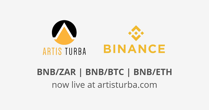 https://miro.medium.com/max/700/1*IRkxuxTl7r1QO486whxkaQ.png Another first! South Africans can now buy @binance Coin with $ZAR Artis Turba is excited to welcome #BNB to South Africa. The following pairs are now live since 15 July 2019 only at http://artisturba.com