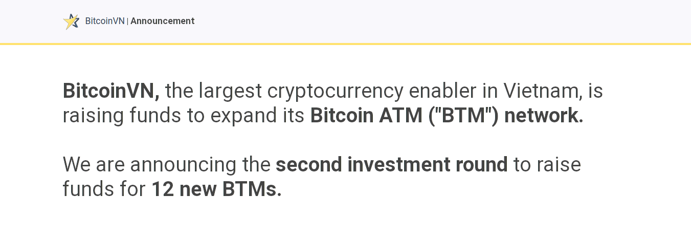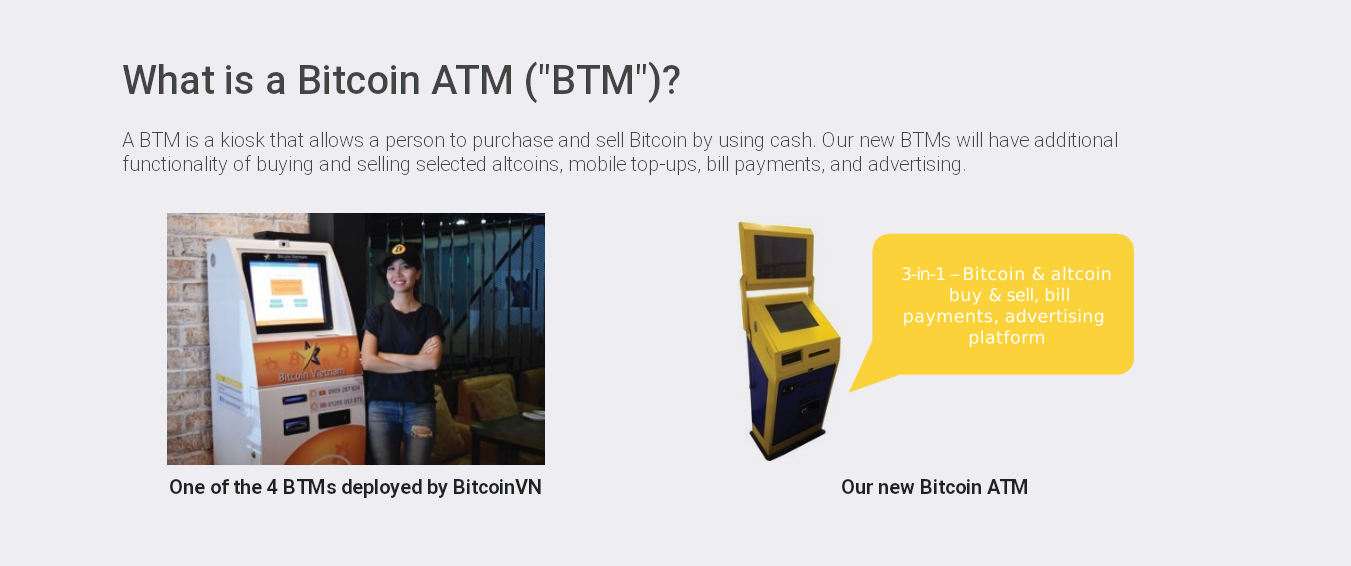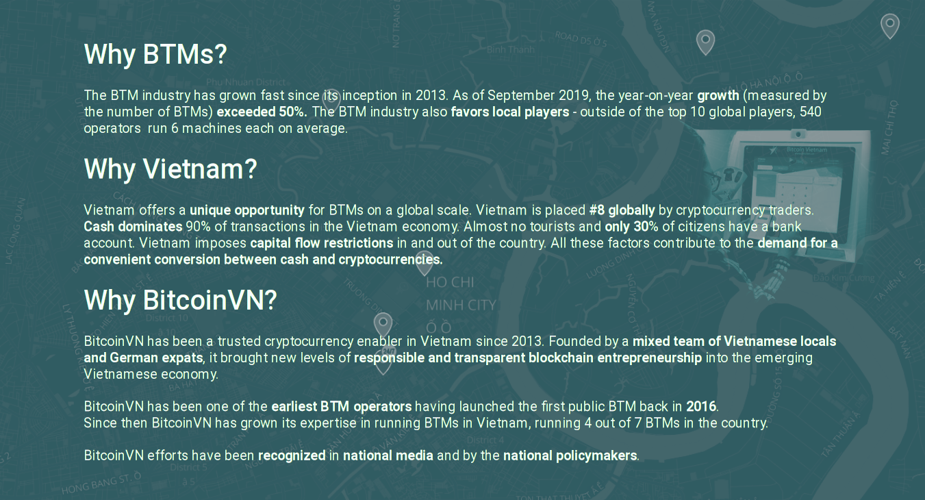 Here is an Interview with Ariel (Nguyen) of Italiani’s (https://news.bitcoinvn.io/interview-with-ariel-nguyen-of-italianis/?lang=en), the first Bitcoin ATM location in Vietnam. Title: Re: Vietnamese Exchange BitcoinVN Is Seeking Investors For 12 New Bitcoin ATMs Post by: stomachgrowls on December 23, 2019, 10:23:38 PM BTM Department BitcoinVN – Bitcoin ATM Fundraising – Update 02.12.2019 (https://news.bitcoinvn.io/btm-department-bitcoinvn-bitcoin-atm-fundraising-update-02-12-2019/?lang=en) Quote With the current batch of 12 machines reaching HCMC port within the coming days the current fundraising round will end by 31.12.2019. We will continue to update on our progress in regard to our network expansion plans and any future upcoming opportunities on our website and via our Social Media channels on Twitter (https://www.twitter.com/BitcoinATMHCMC), Facebook (https://www.facebook.com/BitcoinATMHCMC) and Bitcointalk (https://bitcointalk.org/index.php?topic=5198437.0). We thank everyone for the received support so far and wish everyone a successful last month in 2019! BTM Department – BitcoinVN It isnt bad to seek online investors though but the hard thing here is to trust up on a business where the output is on the other side of the globe/country.Any info's on how much you already raised? Title: Re: Vietnamese Exchange BitcoinVN Is Seeking Investors For 12 New Bitcoin ATMs Post by: BTMBitcoinVN on January 14, 2020, 03:09:30 AM BTM Department BitcoinVN – Bitcoin ATM Fundraising – Update 02.12.2019 (https://news.bitcoinvn.io/btm-department-bitcoinvn-bitcoin-atm-fundraising-update-02-12-2019/?lang=en) Quote With the current batch of 12 machines reaching HCMC port within the coming days the current fundraising round will end by 31.12.2019. We will continue to update on our progress in regard to our network expansion plans and any future upcoming opportunities on our website and via our Social Media channels on Twitter (https://www.twitter.com/BitcoinATMHCMC), Facebook (https://www.facebook.com/BitcoinATMHCMC) and Bitcointalk (https://bitcointalk.org/index.php?topic=5198437.0). We thank everyone for the received support so far and wish everyone a successful last month in 2019! BTM Department – BitcoinVN It isnt bad to seek online investors though but the hard thing here is to trust up on a business where the output is on the other side of the globe/country.Any info's on how much you already raised? Hi, The current fundraising round is closed for further outside investors. The machines have been purchased and have arrived in Vietnam: https://twitter.com/BitcoinATMHCMC/status/1209488409779007493 https://i.imgur.com/F1hmcFA.png Deployment is ongoing: https://news.bitcoinvn.io/first-bitcoin-atm-in-thao-dien-saigon-placed/?lang=en https://i.imgur.com/uBrVI6b.png And while we very(!) well understand the hesitation towards "Crypto business" out of Vietnam, we would like to mention that our mother entity BitcoinVN (http://www.bitcoinvn.io) is Vietnam's oldest Bitcoin Exchange Service (established in late 2013) and partially operated by German Expats/"Bitcoin OG"'s" with a long history in the space :) - see also here for more information: https://bitcointalk.org/index.php?topic=5215245.0 Andrew Rowan also wrote a couple of years back a feature about our mother entity: https://medium.com/@MrRowan/a-brief-history-of-bitcoin-in-vietnam-a41a7b26cb83 We might have other opportunities available in the future, so in case you might be interested to participate in any future expansions feel free to also follow us on Twitter (http://www.twitter.com/BitcoinATMHCMC) or Facebook (http://www.facebook.com/BitcoinATMHCMC) . Title: Re: Vietnamese Exchange BitcoinVN Is Seeking Investors For 12 New Bitcoin ATMs Post by: BtcATMs on February 22, 2020, 04:34:07 PM Hi,