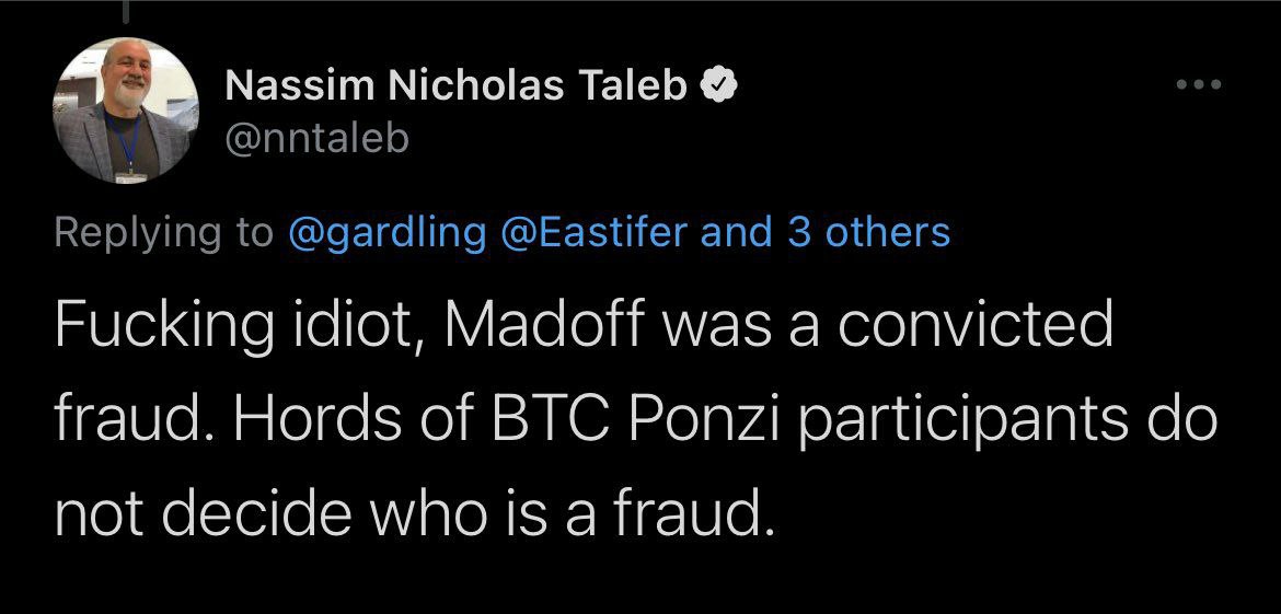 Peraí que vou ali botar fogo nos exemplares do Taleb que tenho aqui em casa e já volto... Guia rápido de como destruir sua reputação em poucos meses. Inacreditável. No assunto do tópico: acabei de ler recentemente "Anatomia do Estado" de Murray Rothbard (https://en.wikipedia.org/wiki/Murray_Rothbard) e achei sensacional. To com mais alguns aqui que estou curioso: "O caminho da servidão" do Hayek e "Democracia, o Deus que falhou". Alguém mais já leu Rothbard aqui? o que mais recomendam dele? Title: Re: MEGATHREAD - os livros que o bitcointalk lê Post by: TryNinja on May 31, 2021, 05:04:16 PM eeeeita que Bizarro @TryNinja Esse foi só o começo. Parece que ele tiltou tanto com o BTC que começou uma cruzada contra ele. :PPeraí que vou ali botar fogo nos exemplares do Taleb que tenho aqui em casa e já volto... Guia rápido de como destruir sua reputação em poucos meses. Inacreditável. Algumas das novas perolas: https://pbs.twimg.com/media/E2oowBuVoAITlOM?format=jpg&name=large https://pbs.twimg.com/media/E2pmSr8XEAoHCpX?format=jpg&name=medium Colocando os screenshots por que ele botou o perfil como privado há um tempinho. Title: Re: MEGATHREAD - os livros que o bitcointalk lê Post by: l3pox on June 02, 2021, 07:14:33 PM concluímos que ele está fora de si.
