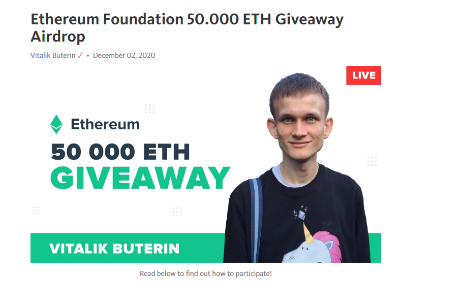Title: Fake 50.000 ETH Giveaway by Fake Vitalik Buterin Post by: sujonali1819 on December 04, 2020, 02:31:17 PM What happened: Fake Vitalik Buterin is running a fake 50.000 ETH giveaway.