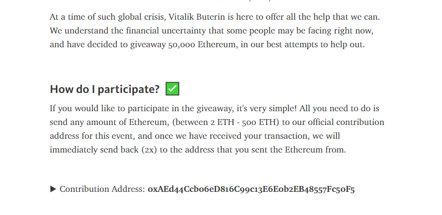 Site link: https://telegra.ph/Ethereum-Foundation-50000-ETH-Giveaway-Airdrop-12-02-2 or https://ethver2.com/ Site link archive: Site info: https://archive.is/wip/2S8vB Code: Expires On2021-12-01 Scammer Eth Address: 0xAEd44Ccb06eD816C99c13E6E0b2EB48557Fc50F5 (https://etherscan.io/address/0xaed44ccb06ed816c99c13e6e0b2eb48557fc50f5) already received 5 eth from two address :'( Website screenshots: ** Recently for ETH 2.0 is LIVE scammer may try to use this as a trick to steal people's money. So beware guys. Don't believe if anybody wants to give you free money like this. Title: Re: Fake 50.000 ETH Giveaway by Fake Vitalik Buterin Post by: Furious 7 on December 04, 2020, 11:53:37 PM With 5 ETH in the scamer's wallet, is this really a victim or is it just my trap so that people will trust more with this fake giveaway?