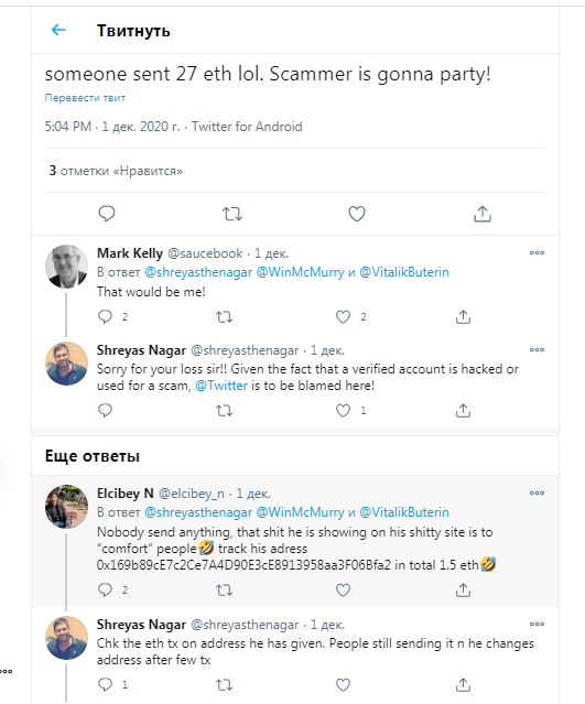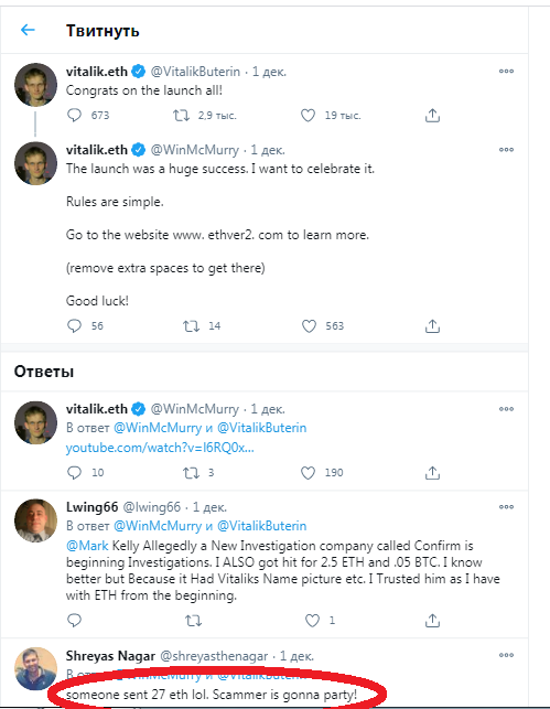 I'm sure it was all a trap and no casualties so I think everyone already knows that this crazy Giveaway is not legal. Title: Re: Fake 50.000 ETH Giveaway by Fake Vitalik Buterin Post by: smyslov on December 05, 2020, 02:48:16 AM With 5 ETH in the scamer's wallet, is this really a victim or is it just my trap so that people will trust more with this fake giveaway? I'm sure it was all a trap and no casualties so I think everyone already knows that this crazy Giveaway is not legal. I also think that way, that's how scammers works they deposit funds to wallets to make it appear that people are depositing and they even show transaction record that they are sending tokens to those participants, I hope that no one will post that they deposited to that address, because that means they are not doing their research and they are uneducated. Title: Re: Fake 50.000 ETH Giveaway by Fake Vitalik Buterin Post by: Basiak on December 05, 2020, 10:25:41 AM With 5 ETH in the scamer's wallet, is this really a victim or is it just my trap so that people will trust more with this fake giveaway? I'm sure it was all a trap and no casualties so I think everyone already knows that this crazy Giveaway is not legal. I also think that way, that's how scammers works they deposit funds to wallets to make it appear that people are depositing and they even show transaction record that they are sending tokens to those participants, I hope that no one will post that they deposited to that address, because that means they are not doing their research and they are uneducated. This tweet suggests that scammers are changing wallets: https://twitter.com/WinMcMurry/status/1333763251755167744 https://s8.hostingkartinok.com/uploads/images/2020/12/b3e3de0cbc1299f455b970e740f7735e.png And this is who it was: https://s8.hostingkartinok.com/uploads/images/2020/12/f452ea262f3969a4065b4d32b4f54b79.png Peace for everyone! Title: Re: Fake 50.000 ETH Giveaway by Fake Vitalik Buterin Post by: tvplus006 on December 06, 2020, 11:19:47 AM In the Wake of the hype associated with the launch of the Ethereum-2 network, scammers are trying to get Ethereum from inexperienced investors. Scammers offer to double your coins in just 24 hours, which is a typical Ponzi scheme. I hope that investors understand that this is a scam and will not send their money to scammers.