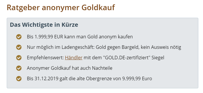 In der Vergangenheit scheint sein Service doch die beste Lösung für dein Anliegen gewesen zu sein. :) Title: Re: Bitcoins in Physisches Gold oder Silber tauschen? Post by: IBMCKU on January 13, 2021, 02:47:57 PM Stimmt, anonyme Tafelgeschäfte, also Goldankauf ohne Nachweis der eigenen Identität, ist nur noch bis 1999,99 € möglich. Bei allen darüber liegenden Summen ist der Händler verpflichtet, die Identität des Käufers festzustellen. Bis 31.12.2019 galt die alte Obergrenze von 9.999,99 Euro Soll heißen der Verkäufer muss wissen wer die heiße Ware gekauft hat, aber melden muss er erst ab 9999 Euro? Oder muss er auch eine Meldung ab 1999 Euro machen? Title: Re: Bitcoins in Physisches Gold oder Silber tauschen? Post by: Lakai01 on January 13, 2021, 03:49:11 PM Soll heißen der Verkäufer muss wissen wer die heiße Ware gekauft hat, aber melden muss er erst ab 9999 Euro? Hier stehts etwas genauer: Oder muss er auch eine Meldung ab 1999 Euro machen? https://i.postimg.cc/fT1GDPR6/screenshot-145.png (https://postimages.org/) Quelle (https://www.gold.de/gold-anonym-kaufen/) Seit etwas mehr als einem Jahr gilt also die Grenze von 1.999,99€ ab der gemeldet werden muss. Davor warens die 9.999,99€ Kaufst du jetzt also bspw. 2k in Gold, dann musst du dich verifizieren. Title: Re: Bitcoins in Physisches Gold oder Silber tauschen? Post by: DeepMining76 on January 14, 2021, 10:55:34 AM Soll heißen der Verkäufer muss wissen wer die heiße Ware gekauft hat, aber melden muss er erst ab 9999 Euro? Hier stehts etwas genauer: Oder muss er auch eine Meldung ab 1999 Euro machen? https://i.postimg.cc/fT1GDPR6/screenshot-145.png (https://postimages.org/) Quelle (https://www.gold.de/gold-anonym-kaufen/) Seit etwas mehr als einem Jahr gilt also die Grenze von 1.999,99€ ab der gemeldet werden muss. Davor warens die 9.999,99€ Kaufst du jetzt also bspw. 2k in Gold, dann musst du dich verifizieren. Hi, Anonym ist doch eh nur der direkte vor Ort kauf, oder? Wie willst du anonym Online bestellen + Lieferung? Muss aber auch sagen habe damit keine Erfahrung. Interessieren würde es mich aber auch wie sowas abläuft. Title: Re: Bitcoins in Physisches Gold oder Silber tauschen? Post by: Souri on January 14, 2021, 01:01:58 PM Je nachdem über wie viel Gold/Silber wir reden und ob du gerne Urlaub machst könnte https://www.bullionstar.com für dich interessant sein.
