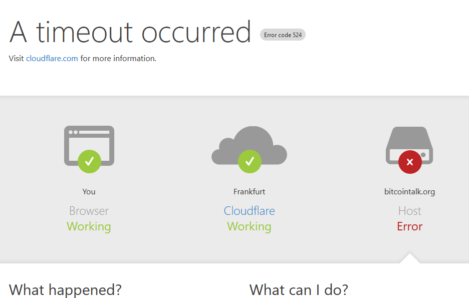 It also looks like it could be due to bitcointalk's server taking too long to respond to cloudlfare. Title: Re: Cloudflare error 524: Problems With The "Forum Ignore User Options" Page Post by: NeuroticFish on November 08, 2022, 03:05:58 PM I have "only" 471 users in my ignore list and it took quite a lot until it loaded up. I feared it'll timeout. If your list is significantly bigger (and I expect so), it could timeout (or give Cloudflare error?). Did it take a significant time before the error? I see others have also complained too that they get bad gateway and cannot update their list (https://bitcointalk.org/index.php?topic=5409748.msg60746102#msg60746102). Title: Re: Cloudflare error 524: Problems With The "Forum Ignore User Options" Page Post by: JollyGood on November 08, 2022, 03:13:46 PM Does that screen come with a Ray ID? If it does you might want to send that as a pm to an admin, they're normally pretty fast at isolating those and fixing them but I think it's harder if you don't have one due to the number of visitors the forum has. I can send a Ray ID but they can easily replicate the issue themselves by adding large numbers of users to their Ignore User list.It also looks like it could be due to bitcointalk's server taking too long to respond to cloudlfare. Yes that is definitely what it looks like, the server is taking too long to respond and timing out.According the Cloudflare link, the issue is because it is timing out most probably because of server resources but I find that hard to believe as the server can carry a phenomenal amounts of load. It could be a misconfiguration issue somewhere but I am sure they will look in to it and work out what is doing it. I have "only" 471 users in my ignore list and it took quite a lot until it loaded up. I feared it'll timeout. Yes that is what seems to be happening, the Cloudflare error page takes a long time to load after the Ignore Preferences page link is clicked. You are right my list was significantly bigger than the 471 you added.If your list is significantly bigger (and I expect so), it could timeout (or give Cloudflare error?). Did it take a significant time before the error? If I remember correctly, while the list was empty the page loaded without issues. When I added a maximum of maybe 7-10 members in one go, it accepted them and loaded fine too allowing me to add and remove further. When I added the full list to the Ignore User Options to stop receiving PMs from those I wanted to add, I think it consisted of over 1700 users in go. I see others have also complained too that they get bad gateway and cannot update their list (https://bitcointalk.org/index.php?topic=5409748.msg60746102#msg60746102). Thank you for the link, I most probably had not noticed the thread. I will read up to see what others are saying.Title: Re: Cloudflare error 524: Problems With The "Forum Ignore User Options" Page Post by: Foxpup on November 08, 2022, 04:03:47 PM This has been a known issue for some time now (https://bitcointalk.org/index.php?topic=1941829.0).