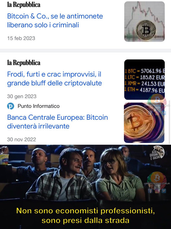 https://i.postimg.cc/8cPNqkG1/Fn5-OXU0-Xg-AAxw-L6.jpg (https://postimages.org/)+ Se volete capirlo meglio guardatevi la puntata di ieri su Youtube di Blockchain Caffè dal titolo "Stampa VS Bitcoin : le balle di carta" in cui Marco Crotta, Federico Rivi e Rikki parlano approfonditamente di questo articolo in cui dal minuto 22 e 53'' si aggiunge anche Vito Lops del Sole 24 Ore. https://www.youtube.com/watch?v=oRre1egmNhc L'ho già linkata in un altro post, ma meglio una in più che una in meno. ;D Title: Re: MEME su Bitcoin e altre cryptovalute Post by: fillippone on February 01, 2023, 06:34:09 PM Meme a tema per questi giorni: https://i.postimg.cc/8cPNqkG1/Fn5-OXU0-Xg-AAxw-L6.jpg (https://postimages.org/)+ Se volete capirlo meglio guardatevi la puntata di ieri su Youtube di Blockchain Caffè dal titolo "Stampa VS Bitcoin : le balle di carta" in cui Marco Crotta, Federico Rivi e Rikki parlano approfonditamente di questo articolo in cui dal minuto 22 e 53'' si aggiunge anche Vito Lops del Sole 24 Ore. https://www.youtube.com/watch?v=oRre1egmNhc L'ho già linkata in un altro post, ma meglio una in più che una in meno. ;D Poveri in nostri "esperti di Cripto", a parte Giacomo Zucco, e forse in un certo senso Rikki, gli altri sono dei veri e propri sapeurs (https://www.bbc.com/news/world-africa-54323473) Title: Re: MEME su Bitcoin e altre cryptovalute Post by: Plutosky on February 18, 2023, 04:39:52 PM Guardatelo vi prego non è un meme ma uno spot ironico sulle CBDC