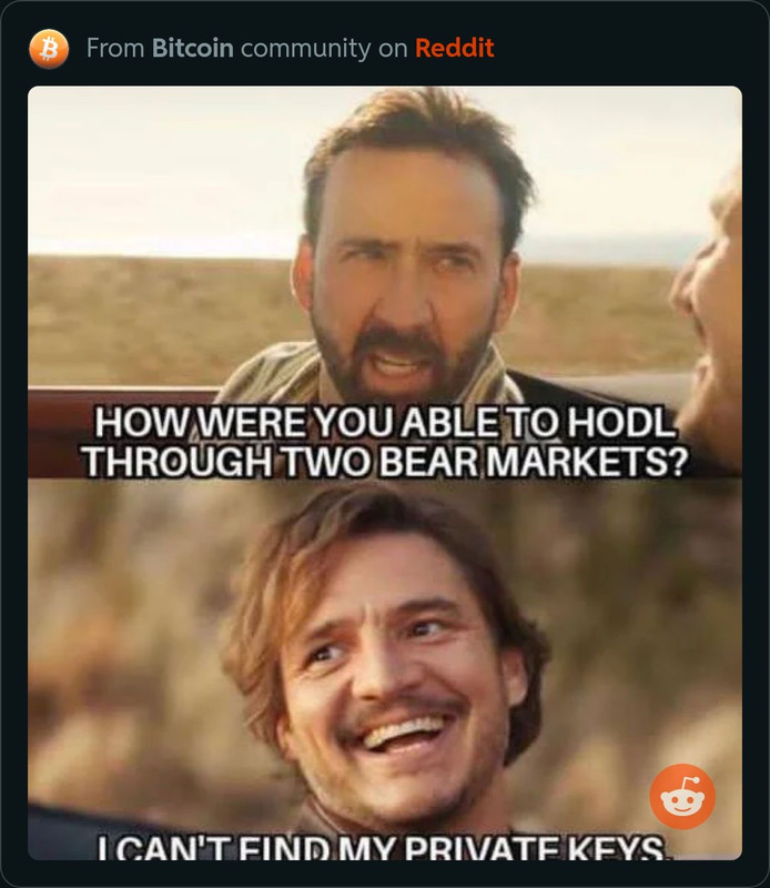 Se c'è una cosa bella della community bitcoin è l'umorismo sarcastico ed un pò laterale, che mi piace tanto. https://i.ibb.co/Js0N7TQ/61357128.jpg Ne ho a caterve... però non poss essere l'unico eh. Suggerisco di seguire @turtlecute su twitter, ottimo temer italiano (oltre che ottimo divulgatore..) Title: Re: MEME su Bitcoin e altre cryptovalute Post by: creep_o on November 27, 2022, 05:40:15 PM Ne ho una marea. Orsù fillippone, non esser tímido. Chi più ne ha più ne metta 🙂Se c'è una cosa bella della community bitcoin è l'umorismo sarcastico ed un pò laterale, che mi piace tanto. Ne ho a caterve... però non poss essere l'unico eh. Title: Re: MEME su Bitcoin e altre cryptovalute Post by: mendace on November 27, 2022, 07:42:54 PM I miei 2sats ragazzi.