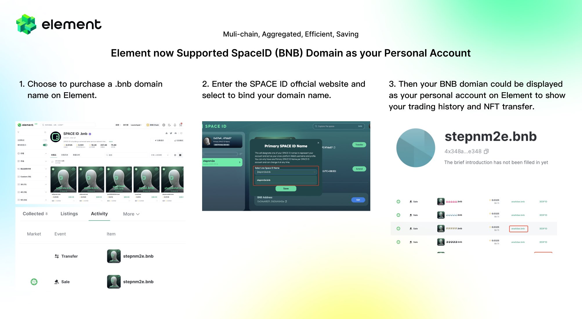 Кампания на Galxe: https://galxe.com/masknetwork/campaign/GCSxCUwQKK Призы на кону: $300 в виде подарочных карт SPACE ID $150 в токенах MASK Для участия: 1. Подпишитесь на https://twitter.com/SpaceIDProtocol и https://twitter.com/realMaskNetwork 2. Сделайте ретвит конкурсного твита: https://twitter.com/realMaskNetwork/status/1605511737465114625 3. Установите расширение MASK со страницы https://mask.io/download-links/ (сомнительной необходимости пункт, так как он никак не проверяется) 4. Добавьте ".bnb" SPACE ID домен к вашему твиттерскому имени или биографии. (снимок будет 26-го декабря) 5. Впишите свой Twitter и SPACE ID (.bnb) домен в этой гуглоформе: https://docs.google.com/forms/d/e/1FAIpQLSe7wzY87RxYATXWC7PQJUmDwfd0gUk1MZVifdS-LQhMuAtAgg/viewform Title: Re: Space ID - универсальные имена вместо адресов! Post by: xandry on December 22, 2022, 09:41:06 PM NFT маркетплейс Element добавил поддержку доменов Space ID: https://twitter.com/Element_Market/status/1605456773480992768