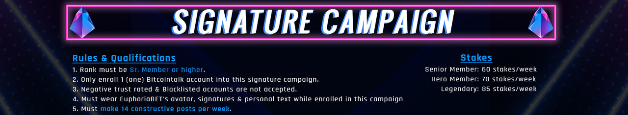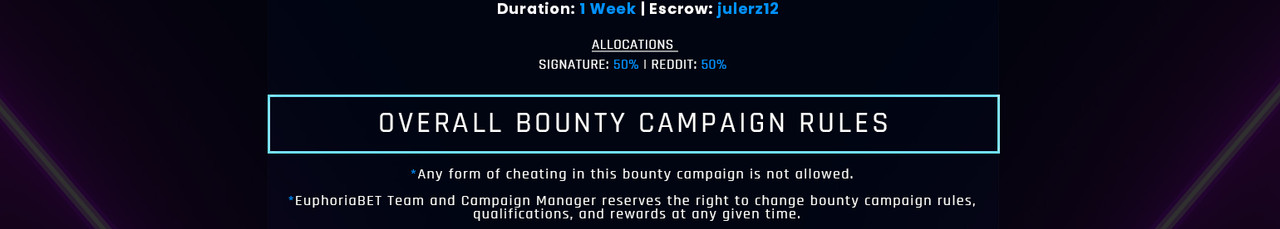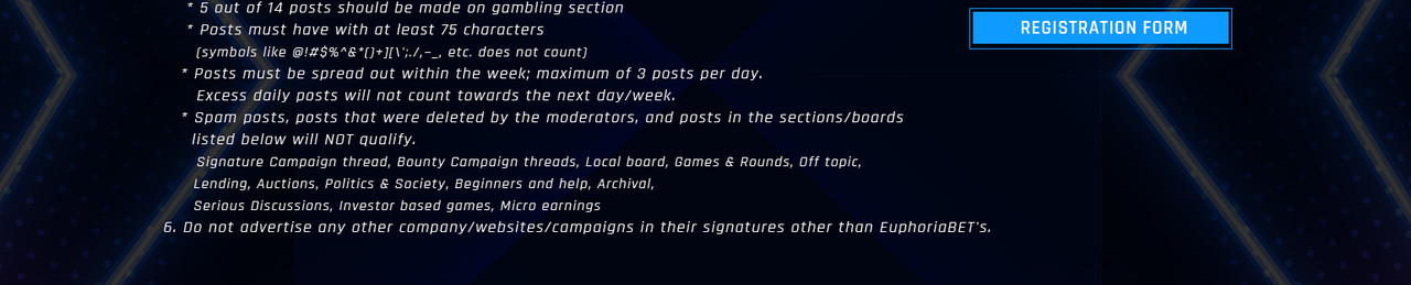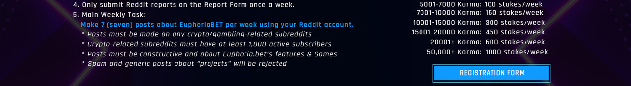 Spreadsheet will be finalized and bounty rewards will be sent after 1 to 2 weeks. EuphoriaBET signatures can now be removed/changed. [EDIT]2/1/2023 EuphoriaBET USDT rewards have all been sent: https://bscscan.com/tx/0xda75d8402e5fae7c79c9c7dcd06cbbdd6bd5257f2d2fcef93d4132e5f27eab4c .....[ WEBSITE (http://hhttps://bit.ly/3kyRtqW) ]...[ PROMOS (https://euphoriabet.io/promo) ]...[ BONUS (https://euphoriabet.io/bonus) ]...[ ANN THREAD (https://bitcointalk.org/index.php?topic=5414541.0) ]...... https://i.postimg.cc/h4NxSkR9/bWGI4RK.jpg (https://bit.ly/3kyRtqW) https://i.postimg.cc/5NvzjsfD/9yp4idH.jpg (https://bit.ly/3kyRtqW) https://i.postimg.cc/XYbC59Jq/1MQ5RXC.jpg (https://bit.ly/3kyRtqW) https://i.postimg.cc/3wr0S72H/5Rlwvc2.jpg (https://bit.ly/3kyRtqW) https://i.postimg.cc/W49FxK7q/tT2nI0J.jpg (https://bit.ly/3kyRtqW) https://i.postimg.cc/KzRkbN9q/FvS1IHM.jpg (https://bit.ly/3kyRtqW) https://i.postimg.cc/kgKy3nV6/FdluGsa.jpg (https://t.me/Jcampaigns) https://i.postimg.cc/MTNcpQNW/ujL1WRo.jpg (https://docs.google.com/spreadsheets/d/1xd8fAYiIhZiHxqC8b5i9Nq2w6Spej7TGI0qEOVmyZaQ/edit?usp=sharing) https://i.postimg.cc/wMN1yBYD/q3sFL0U.jpg (https://bit.ly/3kyRtqW) https://i.postimg.cc/nc8j8qq2/psjcs9g.jpg (https://docs.google.com/forms/d/e/1FAIpQLSf1VVcu2DEh22_ZUu08bXxZS_Q_L1EYU55BPNHPmdQNYvvOUA/viewform) https://i.postimg.cc/HsQJTj2g/hI4LFRt.jpg (https://bit.ly/3kyRtqW) https://i.postimg.cc/3xYkN7SD/sFggJSq.jpg (https://docs.google.com/forms/d/e/1FAIpQLSeSSDsxbJeMRdX_9TggTZa0c6sDc9FvwpQRe_AwscmoBC69zA/viewform) https://i.postimg.cc/7Z9fTcdt/hdEgnk0.jpg (https://docs.google.com/forms/d/e/1FAIpQLSfnPUA4Xk6qJsJv32dFc11QyRW_qk-LVA2a-vjC4YyhUCl5eQ/viewform) https://i.postimg.cc/VNN59gcf/cwd7snA.jpg (https://bit.ly/3kyRtqW) Disclaimer: I am only the Bounty Campaign Manager for this project. I am paid only to manage this bounty campaign. I will not be held responsible should the developers/project team fail to reach their stated goals/obligations to the bounty participants, investors, and everyone else. Join (on this bounty campaign), invest (on their ICO/IDO/IEO), or use their platform at your own risk. Title: Re: 🚧 [BOUNTY] Euphoriabet.io | NO KYC | Crypto Esports Betting [ 1 WEEK ONLY ] Post by: julerz12 on January 23, 2023, 06:38:35 AM .....[ WEBSITE (https://bit.ly/3kyRtqW) ]...[ PROMOS (https://euphoriabet.io/promo) ]...[ BONUS (https://euphoriabet.io/bonus) ]...[ ANN THREAD (https://bitcointalk.org/index.php?topic=5414541.0) ]...... IMPORTANT!! WEEKLY REPORTS FOR REDDIT CAMPAIGN MUST BE SUBMITTED THROUGH THE REPORT FORM. [SEE THE 1ST POST ABOVE FOR THE REPORT FORM LINK] WEEKLY DEADLINE FOR REPORT SUBMISSION: MONDAY [UTC] WEEKLY REPORTS POSTED ON THIS BOUNTY THREAD WILL NOT BE CHECKED/ACCEPTED/COUNTED AND WILL BE DELETED TO AVOID UNNECESSARY SPAM POSTS. ....PROOF OF AUTHENTICATION POST FORMAT.... Fill up the format below and post it on this bounty thread for verification purposes. [ Mandatory to all bounty campaign participants ] Code: Proof of Authentication Post ....THIS CAMPAIGN WILL RUN FOR ONLY 1 WEEK.... WEEK 1 [ 1/24 - 1/30 ] ....AVATAR.... https://i.imgur.com/JjPIJMA.png https://imgur.com/JjPIJMA ....PERSONAL TEXT.... Code: EuphoriaBET.io ....SIGNATURE CODES.... Code: [center][table][tr][td][size=2pt][tt][color=#f044ca]█▀▀▀ Disclaimer: I am only the Bounty Campaign Manager for this project. I am paid only to manage this bounty campaign. I will not be held responsible should the developers/project team fail to reach their stated goals/obligations to the bounty participants, investors, and everyone else. Join (on this bounty campaign), invest (on their ICO/IDO/IEO), or use their platform at your own risk. Title: Re: 🚧 [BOUNTY] Euphoriabet.io | NO KYC | Crypto Esports Betting [ 1 WEEK ONLY ] Post by: AmarScript on January 23, 2023, 06:39:01 AM #Proof Of Registration