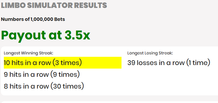 i thought every simulation will be given different results Title: Re: Limbo and Dice Simulator Post by: iv4n on April 12, 2023, 07:04:55 PM ... It's just a small simulator, but a good tool for simulating Limbo or Dice lose/win streaks. ... An advanced version with inc/dec on win/lose and stop on win/lose is comming soon. Btw: It's a real eye opener for people who like to wager at 1.01x. I like simulators, and I tried different ones. It's for people who like auto-betting in general, especially for people like me who gamble with different coins... https://i.postimg.cc/zfGMSB4m/image.png Well, this basic simulation is really basic, not bad... 39 loss streak at x3.5 is more than possible in million bets, it can be even higher. ;) But I like when the simulator has other options, I guess we will see those options in advanced mode, which is coming. Looking forward to that. By the way, every time we try the simulator we will be redirected to some casino. I don't mind, but some people don't like those things. Good luck! I hope you will finish advanced mode. Title: Re: Limbo and Dice Simulator Post by: ryzaadit on April 12, 2023, 08:38:24 PM I don't know if people are still gonna use the simulator.