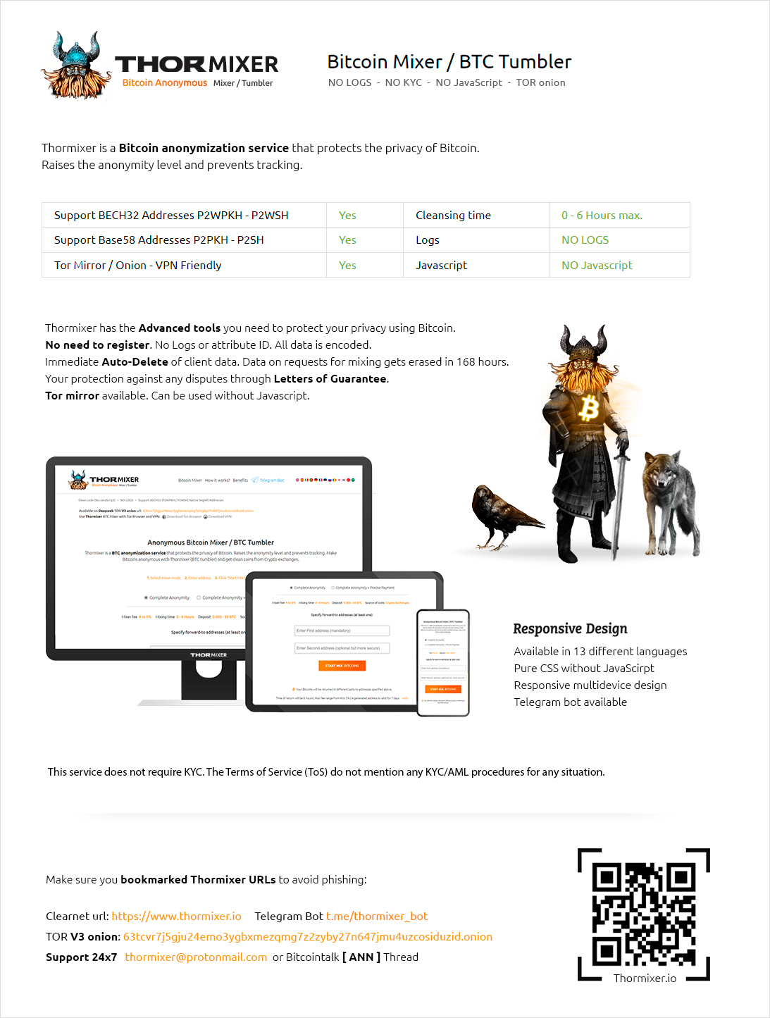Title: [ANN] [banned mixer] - Bitcoin Mixer | BTC Tumbler | Anonymous | NO LOGS | NO JS Post by: Thormixer on July 03, 2023, 02:12:17 PM [banned mixer] BTC mixer • /] Clearnet (https://www.[banned mixer) • /] TOR (http://[banned mixer) • Telegram Bot (https://t.me/thormixer_bot) • Discussion in ➔ English (https://bitcointalk.org/index.php?topic=5458437) | Pyccкий (https://bitcointalk.org/index.php?board=10.0) | Deutsch (https://bitcointalk.org/index.php?board=16.0) | Français (https://bitcointalk.org/index.php?board=13.0) | Română (https://bitcointalk.org/index.php?board=108.0) | 日本語 (https://bitcointalk.org/index.php?board=252.0) | 한국어 (https://bitcointalk.org/index.php?board=82.0) | 中文 (https://bitcointalk.org/index.php?board=30.0) | عربي (https://bitcointalk.org/index.php?board=241.0) /]https://i.postimg.cc/p2c19WVY/bitcoin-mixer.jpg (https://www.[banned mixer) During challenging periods such as these, where even the tiniest online stores or digital currency platforms monitor each of your transactions, it's crucial to prioritize privacy. After all, safeguarding privacy is an inherent entitlement of every individual and should not be overlooked. Given the nature of the blockchain network, it is possible for almost anyone to trace the flow of your funds or even access the overall balance of your wallet. We perceive this as an intolerable breach of privacy, prompting us to develop [banned mixer] as a solution to tackle this concern. With www.[banned mixer] you can safely mix your bitcoins with lowest possible fee and maximum privacy. Clearnet: https://www.[banned mixer] Tor Mirror: http://[banned mixer] What is [banned mixer]? [banned mixer] is a Bitcoin Mixer / BTC Tumbler. Our transfer algorithm selects independent investors and trading platforms, and breaks down your funds in a manner that completely removes a link between input and output transactions. We neither require registration nor store logs. Once the mixing is done and transaction confirmed, the data on processed transactions is deleted. For each mixing request, we issue a digitally signed letter of guarantee, which confirms our obligations to the client. While mixing BTC, [banned mixer] does not shuffle available funds in one or multiple pots, but exchanges incoming bitcoins with coins purchased from investors / cryptocurrency platforms. Can I trust you with my Bitcoins? All users are protected by the platform against accidental errors or deliberate actions, we take protective measures against errors and malicious acts. For every incoming order, we provide a PGP-signed letter of guarantee that confirms the obligations we assume. To check a letter of guarantee, install a PGP client (for example, PGP4Win (https://www.gpg4win.org/download.html)), import [banned mixer] public key and verify a digital signature. How does [banned mixer] guarantee my anonymity? Thormixer do not collect logs or private information. We assure you that we strictly adhere to a no-logs policy and refrain from storing any personal information. Furthermore, our team operates anonymously. The main principle of the platform operation is the provision of funds to end customers from a hundred different investors from various stock exchanges. All info about an order is deleted upon its completion (or when the offer expires). The only remaining trace of our work are the letters of guarantee we give you. Thormixer works without JavaScript. To increase the level of anonymity, you can use the Tor version. How long do addresses for funds transfer remain valid? They remain valid for 7 days. This period is sufficient to address any network issues, delays and human errors that may occur, thus guaranteeing safety of customer's assets. Anyway, in all cases an address lifetime for every request is captured in a letter of guarantee provided by [banned mixer]. How long does it take to cleanse Bitcoins? The process starts after the first confirmation of your incoming transfer and takes up to 6 hours. The exact delay is chosen randomly in order to resist deanonymization attempts. We have found that a random delay of up to 6 hours is enough to eliminate the risk of volume analysis. Find answers to all additional questions in FAQ section - https://www.[banned mixer]/#FAQ NO LOGS - Our service has a zero-logs policy, we don’t store any users personal info. NO JavaScript - Thormixer works without JavaScript. No JavaScript = No Problems. NO Analytics - We don't use Google Analytics or search console. Tor Mirror / Onion - To increase the level of anonymity, use the Tor version (http://amwnnncglaw27kfomeiszq4eltwkktnkdzjg6kbtjwb2w3zgysatjead.onion). Bech32 (P2WPKH - P2WSH) Support all types of bitcoin addresses except Taproot (P2TR). Base58 (P2PKH - P2SH) Support all types of Btc addresses except Taproot (P2TR). Full Responsive – Desktop, Smartphone and Tablet Friendly. Make sure you bookmarked our URLs to avoid phishing: Clearnet: https://www.[banned mixer] Tor Mirror: http://[banned mixer] Support 24x7: support@[banned mixer], thormixer@protonmail.com, Profil Message (https://bitcointalk.org/index.php?action=pm;sa=send;u=3559560) or Ann Thread (https://bitcointalk.org/index.php?topic=5458437.msg62497689#msg62497689) Title: Re: [ANN] [banned mixer] - Bitcoin Mixer | BTC Tumbler | Anonymous | NO LOGS | NO JS Post by: Thormixer on July 03, 2023, 02:35:31 PM Reserved for updates