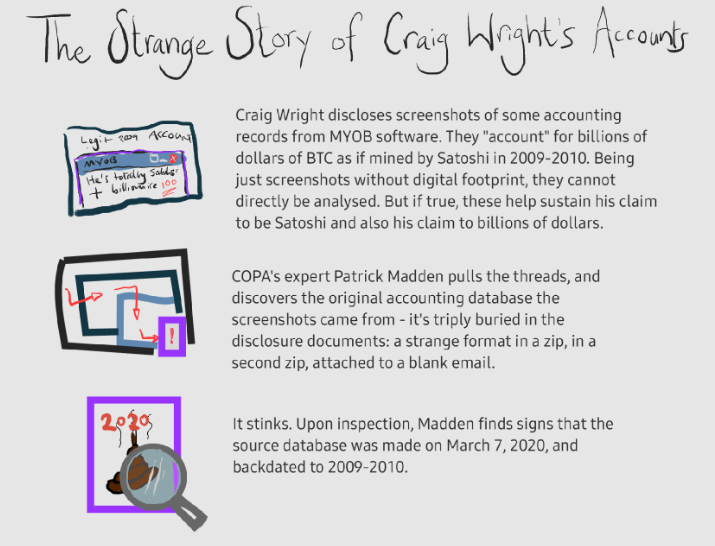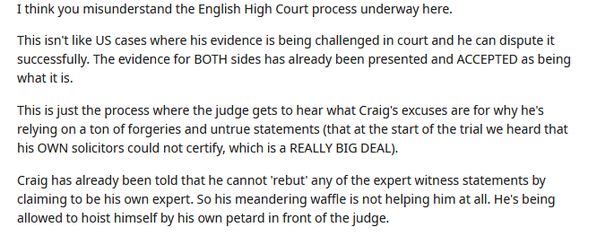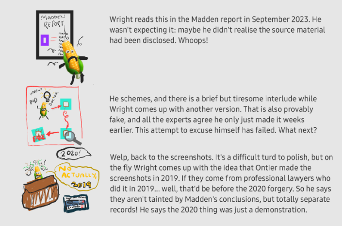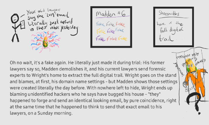 Mostly boring in court today and ended a little early today as Craig's council decided not to cross-examine their own forensic experts given the obvious. COPA witness Patrick Madden was cross-examined for most of it and I don't think he came across great or did any favours for COPA, but the day ended on an absolute bombshell with the revelation Craig had supplied a forged email purported to be from his previous lawyers and even better was put forward by Craig's own council. Craig's previous lawyers confirmed the faked emails Craig has submitted so that's another nail in Craig's coffin surely. Further details on what actually happened here: https://blog.bitmex.com/copa-vs-csw-day-16-craigs-lawyers-do-copas-job-for-them/ Who said he's a security expert? That's a title Craig has given himself, but given he gets hacked regularly when it's convenient for him as an excuse I'd say I'm more of a security expert than Craig. I don't think that australian stock exchange would hire someone incompetent for monitoring their systems . Oh, well I guess Craig is Satoshi then :o. Did they hire a so-called security exert who gets hacked multiple times a year? I haven't seen any evidence of him doing anything with the Australian stock exchange, and the same goes for most of Craig's fabricated C.V. What Craig usually does - assuming the claim isn't just a flat-out lie in the first place - is take a kernel of the truth and either inject some backdated lies into it or shit some more lies all over it, sometimes both. Take the meeting minutes from BDO Kendalls: https://storage.courtlistener.com/recap/gov.uscourts.flsd.521536/gov.uscourts.flsd.521536.828.34.pdf BDO, a company Craig allegedly worked for, but obviously never had anything to do with bitcoin, so Craig forges and backdates some 'proof' that alleges he mentioned bitcoin long before the publication of the whitepaper, only he gets caught in this physical fraud by writing the notes on a notepad confirmed by the makers to not have existed at the time. Craig lies so much it's impossible to know when he's telling the truth, but you can usually assume he is not. Christen Ager-Hanssen released his evidence against Craig today which is worth a read: https://medium.com/@agerhanssen/bdo-drive-october-2007-extracted-2023-you-wanted-evidence-82593c431a11 Along with a load of texts: https://twitter.com/agerhanssen/status/1762110519010312307 For those wanting a current update I would recommend checking out the latest Dr Bitcoin podcast: https://www.youtube.com/watch?v=aproxaMcFL4 Title: Re: Updates from the COPA v Craig Wright trial Post by: hilariousetc on February 29, 2024, 08:42:14 PM Day 17