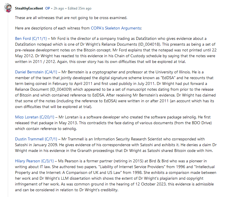I've been watching the entirety of the Crypto Open Patient Alliance -v- Dr Craig Steven Wright trial down in London which started today and plan to watch as much of it as I possibly can. Decided to start a thread for daily updates and discussion. Not much has happened so far and just seems to be the opening statements. COPA briefly went through a handful of the forged documents including the LaTeX whitepaper and Craig's defence seemed to consist of just letting the court know about Craig's autism and previous suicide attempt due to the stress of trying and failing to prove he's Satoshi. I guess they know they're probably not going to win this so are going for the sympathy route or at least bracing themselves for inevitable failure and using Craig's autism as an excuse for the lies and forged documents. Timeline: https://www.talkimg.com/images/2024/02/05/v67uD.jpeg For those not in the know: https://www.france24.com/en/live-news/20240205-uk-trial-opens-into-bitcoin-inventor-claims Quote Wright, 53, says he is Satoshi Nakamoto, the pseudonym of bitcoin's creator and author of a white paper that introduced the cryptocurrency to the world in 2008. Crypto Open Patent Alliance (COPA), a non-profit organisation set up to keep cryptocurrency technology free from patents, is suing Wright over his claims first made in 2016. The trial at London's High Court, presided over by judge James Mellor, is expected to last until mid-March. "Over a period of nearly 10 years... (Wright had) the strongest incentive to prove he is Satoshi Nakamoto -- but single handedly failed," said COPA lawyer Jonathan Hough in opening remarks. Documents provided by Wright were not written in the same software code as the original 2008 white paper, according to Hough. "COPA's case is, simply, that Dr Wright's claim to be Satoshi is a lie, founded on an elaborate false narrative and backed by forgery of documents on an industrial scale," the lawyer added in a written submission. "As his false documents and inconsistencies have been exposed, he has resorted to further forgery and ever more implausible excuses." COPA wants the High Court to rule that Wright -- who is expected to face questioning on Tuesday -- is not Satoshi. The enigmatic programmer describes himself as "Creator of Bitcoin" on social media platform X. "I conceived bitcoin, and I unveiled it to the world," he wrote last month in a posting on X, formerly known as Twitter. Wright, who on his website describes himself also as a businessman, has been involved in a number of lawsuits brought by himself but this time around is being asked to defend himself. COPA brings together heavyweights in the industry, including cryptocurrency platform Coinbase and Block, which specialises in digital payments. It accuses Wright, nicknamed 'Faketoshi' by his detractors, of lying about his identity and of forging and manipulating documents presented to try and prove his claims. The outcome of the case could determine that of another pitting Wright against 26 developers -- including Coinbase -- for allegedly infringing upon his intellectual property rights. Or just watch the Dr Bitcoin podcast on COPA vs. Craig Wright: https://www.youtube.com/watch?v=2e0cAqs-0ng If anyone has any questions feel free to ask. Updates: Day 2: https://bitcointalk.org/index.php?topic=5484211.msg63623032#msg63623032 Day 3: https://bitcointalk.org/index.php?topic=5484211.msg63630400#msg63630400 Day 4: https://bitcointalk.org/index.php?topic=5484211.msg63633942#msg63633942 Day 5: https://bitcointalk.org/index.php?topic=5484211.msg63639614#msg63639614 Day 6: https://bitcointalk.org/index.php?topic=5484211.msg63652331#msg63652331 Day 7: https://bitcointalk.org/index.php?topic=5484211.msg63659056#msg63659056 Days 8-11: https://bitcointalk.org/index.php?topic=5484211.msg63688503#msg63688503 Day 12: https://bitcointalk.org/index.php?topic=5484211.msg63693964#msg63693964 Day 13: https://bitcointalk.org/index.php?topic=5484211.msg63698891#msg63698891 Day 14: https://bitcointalk.org/index.php?topic=5484211.msg63707433#msg63707433 Day 15: https://bitcointalk.org/index.php?topic=5484211.msg63709690#msg63709690 Day 16: https://bitcointalk.org/index.php?topic=5484211.msg63723561#msg63723561 Day 17-18: https://bitcointalk.org/index.php?topic=5484211.msg63739261#msg63739261 Day 19: https://bitcointalk.org/index.php?topic=5484211.new#new Dr Bitcoin Podcast updates: Part 1: https://www.youtube.com/watch?v=2e0cAqs-0ng&t Part 2: https://www.youtube.com/watch?v=5VZE-oc8cEA Part 3: https://www.youtube.com/watch?v=jYibVsBxid0 Part 4: https://www.youtube.com/watch?v=aproxaMcFL4 Part 5: https://www.youtube.com/watch?v=YS9_GQkMAic Part 6: https://www.youtube.com/watch?v=_ieqSOUCaBM Part 7: https://www.youtube.com/watch?v=EWiLW_ASbOk Title: Re: Updates from the COPA v Craig Wright trial Post by: DaveF on February 05, 2024, 05:21:12 PM You might want to close/lock this and open another thread that's self moderated.