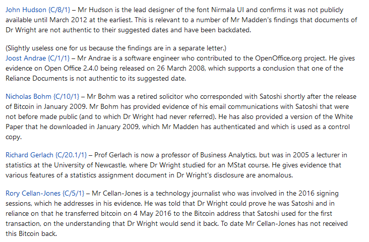 Very short day today as Craig's council has decided not to bother cross examining several witnesses due to them obviously not going to help in Craig's favour. One person that was meant to be examined today was Rory Cellan-Jones who used to work for the BBC and was involved when Craig tried and failed to out himself to the BBC. He instead published a blog today about his experience with Craig: https://rorycellanjones.substack.com/p/the-battle-of-bitcoin Craig still owes him 0.01701 BTC in bitcoin which was worth around £5 at the time but is now worth around £700. He should sue him to get it back ;D. The Dr Bitcoin podcast also published an interview with Rory today: https://www.youtube.com/watch?v=secLQHfCaTI Here's a list of people who will now not be appearing: https://pbs.twimg.com/media/GGzZ5nyaAAEC9wW?format=png&name=900x900 https://pbs.twimg.com/media/GGzaF7ZasAADRC9?format=png&name=900x900 emphasis: he hires people to do all his work. he cant code and nor alot of other things he doesnt do but pretends to/claims to. Another thing to note here is I don't think he does actually hire people. Passing the buck on to someone else is just part of his lie-arsenal now. How else can he explain away some plagiarism or dodgy backdating editing that is on his personal blog or papers or whatever else. He has to dream up a scenario where he is not responsible otherwise he's guilty and he's been caught in the act, and in court that's contempt which can land him in prison. As long as he passes the buck and sows enough doubt the courts may not bother prosecuting. Even if they did I'm sure Craig would just flee the country again to avoid trial/prosecution. Title: Re: Updates from the COPA v Craig Wright trial Post by: franky1 on February 21, 2024, 05:15:56 PM emphasis: he hires people to do all his work. he cant code and nor alot of other things he doesnt do but pretends to/claims to. Another thing to note here is I don't think he does actually hire people. Passing the buck on to someone else is just part of his lie-arsenal now. How else can he explain away some plagiarism or dodgy backdating editing that is on his personal blog or papers or whatever else. He has to dream up a scenario where he is not responsible otherwise he's guilty and he's been caught in the act, and in court that's contempt which can land him in prison. As long as he passes the buck and sows enough doubt the courts may not bother prosecuting. Even if they did I'm sure Craig would just flee the country again to avoid trial/prosecution. its more about this: https://craigwright.net/about/academic-degrees/ he says he has dozens of degree's.. but to be able to write so many papers at some points, in such quick succession to hand in within day/weeks of each other.. indicate someone else was paid to write them usually degrees take years to do one (i have not contacted the universities to even check validity of the list..) if those do validate, (but obviously contain alot of plagiarisms) it just wreaks of the smell of someone that just goes on fiverr and pays minimum amounts for a quick paper, for someone to write(copy and paste from un-cited sources) something about [insert topic] and then gets a editor in his team to look at it to make sure its ontopic to just submit as if wrote by CSW ..its the only common sense, logical, timelime that make sense Title: Re: Updates from the COPA v Craig Wright trial Post by: OgNasty on February 21, 2024, 11:59:35 PM Seemed like a rough day for bitcointalk in this trial. They seemed to go after Blockstream pretty hard and made it public knowledge that satoshi’s account here was removed from him as well as his commit access. Sure, there’s reasons these things happened, but it sounded bad the way it was presented.