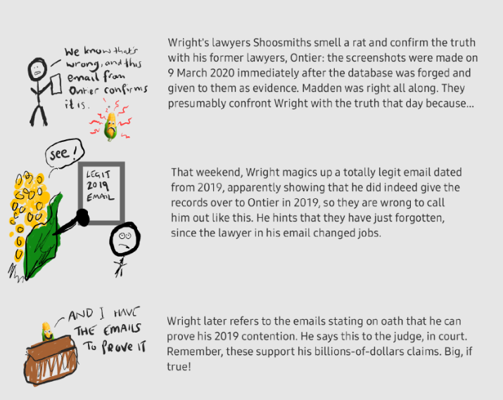 The shortest day of the trial so far at little over an hour due to Craig's side dismissing most of their witnesses. Not much happened obviously, but the day opened with COPA confirming the recent email forgeries and they would have a report ready on them soon. Day 18 The "cryptocurrency expert" Prof Sarah Meiklejohn came across very well. It's funny how lawyers try to spin things in both ways. When Craig is caught plagiarising and his excuse is I was hacked, it's always well, is it possible he was hacked?, and the answer of course is I suppose it is possible, but just like it's possible aliens from another dimension also beamed the forgeries onto his computer from their spaceship. I mean, you can't prove that they didn't do that, so I suppose it is possible. When they were going over Craig's failed signing sessions Meiklejohn gave several ways Craig could have faked them including domain spoofing, wifi-hijacking etc, and Craig's team were pushing these as pie-in-the-sky claims but Meiklejohn's it is possible was dismissed as unlikely fancifulness, even though she stated she didn't believe this is what likely happened (I don't think Craig is smart enough to do this when all it takes is changing a bit of code in electrum, which is probably what he did). Zem Gao, a blatant Craig Wright fanboy was also cross-examined. I missed the first part of his evidence and him being sworn in and I initially thought he was on COPA's side he was making Craig look so bad. Not sure why Craigs defence had him on, and they ended with going through all his pro-Craig writings at the end which was pretty much an embarrassing slam dunk for his impartiality. There was no day in court today and the trial will resume tomorrow, and if I understand correctly, Craig is back on the stand to answer the recent admission of the forged email. This should be interesting, but of course he will almost certainly just blame someone else. Hopefully both COPA and the judge take this opportunity to grill Craig rather than just letting him pass the buck to someone else, especially as this is a forgery that took place during the trial. For those wanting a quick refresher here is what happened with the forged email: Quote December 2019: Craig and Ontier had an unrelated email exchange March 2020: Craig sends MYOB login info to Ontier, and they make screenshots that same day 8 Feb 2024: * Craig is on the stand stating that Ontier received his MYOB login in 2019 * Ontier emails Shoosmiths stating that they did create the screenshots in March 2020, not earlier 18 Feb 2024: Craig sends an email to Ontier backdated to December 2019, makes it look part of that December 2019 email thread. 23 Feb 2024: * Craig is on the stand again, affirming his previous statement and claiming he has the emails * Ramona [Craig's wife] hands over backdated email * Shoosmiths asks Ontier, attaches backdated email * Ontier reconfirms no login details before March 2020, backdated email was found on their system but found to be received 18 Feb 2023, appears to be part of a December 2019 thread but different. https://twitter.com/oisyn/status/1763202102266929394 If you want to enjoy another couple of Craig's unbelievably stupid and sloppy forgeries here's a two more: https://twitter.com/Arthur_van_Pelt/status/1763201157713838500 https://twitter.com/Arthur_van_Pelt/status/1763252633177915783 And if you want to read the COPA forensic reports used during the trial here they are: https://www.dropbox.com/scl/fo/4y3gdele4foy15006z8ch/h?rlkey=scs42wew1o3vwfv0nduhc43dm&e=4&dl=0 Title: Re: Updates from the COPA v Craig Wright trial Post by: franky1 on February 29, 2024, 10:21:41 PM i hope copa lawyers actually use the airport bag security check-in analogy