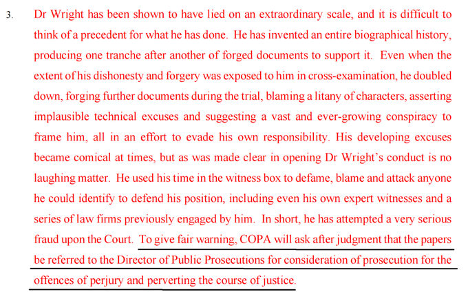 the writeup of the judgement has been published. a good read. and can helpout c0bra's case to be rejudged in cobra's favour Title: Re: Updates from the COPA v Craig Wright trial Post by: hilariousetc on May 30, 2024, 09:17:15 AM https://www.judiciary.uk/wp-content/uploads/2024/05/COPA-v-Wright-Judgment.pdf the writeup of the judgement has been published. a good read. and can helpout c0bra's case to be rejudged in cobra's favour That was pretty brutal. Quote Dr Wright presents himself as an extremely clever person. However, in my judgment, he is not nearly as clever as he thinks he is. In both his written evidence and in days of oral evidence under cross-examination, I am entirely satisfied that Dr Wright lied to the Court extensively and repeatedly. Most of his lies related to the documents he had forged which purported to support his claim. All his lies and forged documents were in support of his biggest lie: his claim to be Satoshi Nakamoto. I'm glad the judge saw through Craig's several layers of bullshit. Hopefully we see criminal charges now. I can't see why not given even the judge knows he lied throughout and even got caught fabricating evidence mid-trial. I wonder if Craig is getting ready to bounce from the UK to evade potential prosecution. The Dr Bitcoin Podcast did an update on the judgment and is worth listening to for all the juiciest bits if you don't want to read the entire thing: https://www.youtube.com/watch?v=EWiLW_ASbOk Title: Re: Updates from the COPA v Craig Wright trial Post by: gmaxwell on May 30, 2024, 09:46:46 AM Next events will be on the 7th with the form of order hearing where you'll hear the injunctive relief we're seeking against Wright, but even with that aside this bullshit isn't over yet: The lawsuit against exchanges for delisting BSV hasn't been dropped.