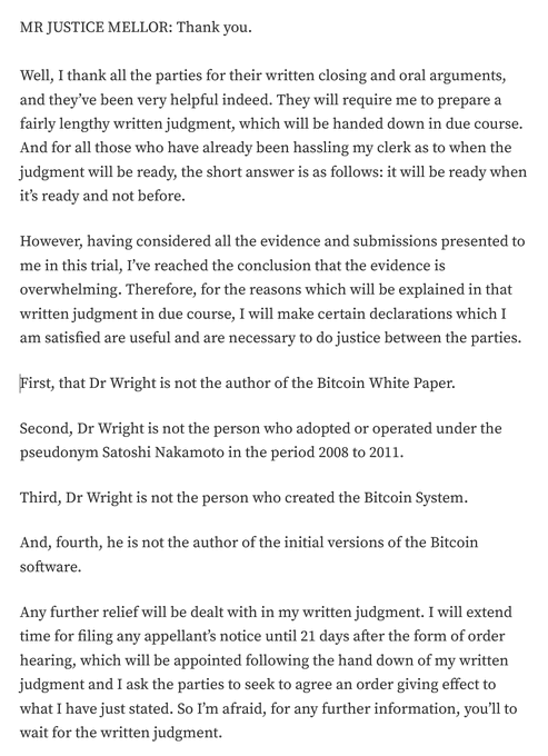 BREAKING NEWS The judge made a shock preliminary announcement that "due to overwhelming" evidence Craig Wright is not is not the author of the whitepaper, not the creator of bitcoin, does not own any IP of bitcoin, and is not Satoshi Nakamoto. I had to double check when he made the announcement as I was not expecting that until the end of the month. The judge also announced that we will have to wait 20 days for the full report and for the conclusion of the trial. Given this judgement that should surely indicate that Craig has lied throughout the trial and surely we should be seeing a prosecution for contempt and perjury. https://pbs.twimg.com/media/GIoyDzsXwAAupGv?format=png&name=small ?? his council say its his human right to make such claims.. ?? (facepalm) heck even dorian cant just take over IP rights of bitcoin, and his name was dorian satoshi nakamoto i too can change my name to elon musk.. and thats my human right... but its not then my human right to cause fraud to proclaim myself as THE elon musk that owns spaceX and twitter and tesla. so yea his council should be barred from standing in court ever again.. even they should know the basics of law that define naming yourself a random name of S.N. vs claiming to be a specific S.N entity that created something that a idiot is trying to steal.. I can kind of see their argument from some sort of namby-pamby liberal stance, but the whole point of this trial is to prove Craig is a fraudster and should not be allowed to continue his fraud or his vexatious litigation against innocent people. Without it Craig is free to lie and claim to be someone he's not. I'm sure Craig will probably just take his case to some other country that will have him but I'm hoping his financial backers will now just pull the plug which should put an end to Craig's legal shenanigans, but hopefully he ends up in prison where he can't do any more damage to the bitcoin community. Title: Re: Updates from the COPA v Craig Wright trial Post by: DaveF on March 14, 2024, 03:20:26 PM Good news.