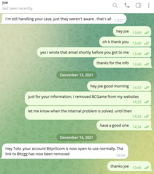 Nonetheless, the staff assured me that once you complete the KYC they required [which was set to validate/invalidate the multi acc allegation] and passed them, your account will be restored. Title: Re: BCGame withdraw and tip permission have been suspended. Post by: examplens on October 02, 2024, 01:42:46 PM Until this is resolved I removed BCGame from all my websites. I will be a little off-topic, but this attitude makes your directory site unreliable because the listing depends exclusively on your affiliate profit. It could even be considered a kind of blackmail. because for every misunderstanding, you exclude them from the listing. Title: Re: BCGame withdraw and tip permission have been suspended. Post by: Stakefast on October 03, 2024, 09:00:46 AM OP, I heard back from BC staff earlier today. They got to the bottom of your situation and what you suspected is kinda true, that you got blocked due to multi-acc detection. Whether it's the old account that's now closed or it's a different account, I can't be sure as they didn't tell me that far. Nonetheless, the staff assured me that once you complete the KYC they required [which was set to validate/invalidate the multi acc allegation] and passed them, your account will be restored. Funny enough, they restored my account already. They did not even contacted me, nothing. Until this is resolved I removed BCGame from all my websites. I will be a little off-topic, but this attitude makes your directory site unreliable because the listing depends exclusively on your affiliate profit. It could even be considered a kind of blackmail. because for every misunderstanding, you exclude them from the listing. I see your point, allthough its not blackmailing. Blackmailing would be if I had some evidence of cheating/wrongdoing and I am sharing it to the world in case they won't unban my account. I just took action because of a ban of my account with no reason. Topic can be closed. I also won't add BC to my websites anymore. Title: Re: BCGame withdraw and tip permission have been suspended. Post by: examplens on October 03, 2024, 09:26:29 AM I see your point, allthough its not blackmailing. Blackmailing would be if I had some evidence of cheating/wrongdoing and I am sharing it to the world in case they won't unban my account. You still have 2500+ referrals, I believe that a good part of them are still active. With that, you will have more income from there in a longer period. I would advise you to insist on clarifying the whole matter and to demand that they completely delete your duplicate account to avoid 'misunderstandings' in the future.I just took action because of a ban of my account with no reason. Topic can be closed. I also won't add BC to my websites anymore. Yes, you can lock this topic and add a [SOLVED] mark in the subject. Title: Re: BCGame withdraw and tip permission have been suspended. Post by: holydarkness on October 03, 2024, 09:40:38 AM OP, I heard back from BC staff earlier today. They got to the bottom of your situation and what you suspected is kinda true, that you got blocked due to multi-acc detection. Whether it's the old account that's now closed or it's a different account, I can't be sure as they didn't tell me that far. Nonetheless, the staff assured me that once you complete the KYC they required [which was set to validate/invalidate the multi acc allegation] and passed them, your account will be restored. Funny enough, they restored my account already. They did not even contacted me, nothing. [...] Probably because the staff I am in communication with checked your UID and get to the bottom of the multi-acc themselves and learned that the multi-acc situation was already cleared in the past, when it first arise, given I gave them the screenshot of the conversation you had with your former host. Probably something else. Nonetheless, if you're satisfied with this outcome, lock the thread. Only you and mods can "close" the topic by locking it. So, do us a favor by pressing that button on the bottom left of the page. |