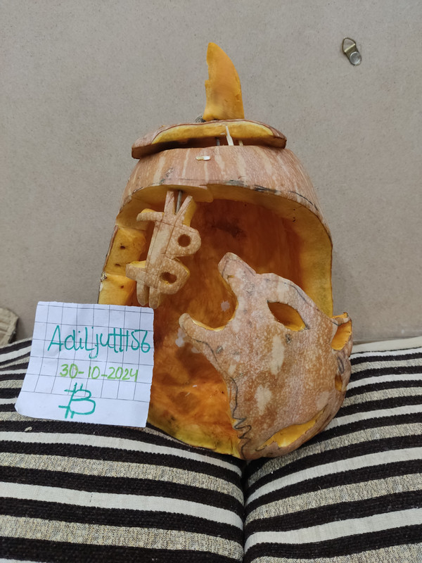 After seeing your quote I am smiling to myself :D ;D, and I am writing with a smile on my face :D. I really should have enhanced the beauty through some process here. My biggest problem is that I am not very good at manual work and I have very little patience for these tasks :-\. I am not good at small difficult tasks. Participating in this competition and teaching handiwork was my value objective. Take love dear! aliveNFT is correct here. A signed sheet should be next to the FINISHED product, or unfortunately it will not count. So just make sure you do so, no big deal. You’ve got a great entry here. Discussion allowed! Are participating participants allowed to vote?Or are participants not allowed to vote? Yes, anyone who participates will be allowed to vote as well when the time comes. Title: Re: 🎃 [ANN] Bitcointalk Bitcoin Pumpkin Carving Contest 🎃 Post by: Porfirii on October 07, 2024, 07:13:44 PM My pumpkin :)