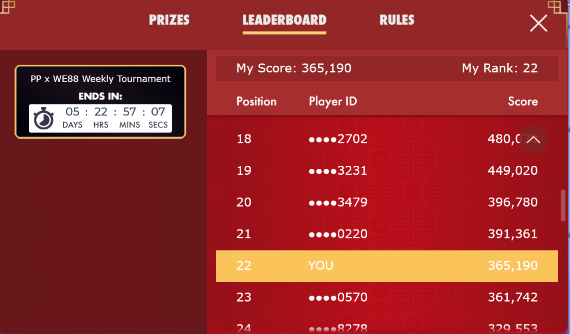 The #1 got score 1,892,767 meaning he wagered (1,892,767/100)*14,700 = IDR 278,236,749 already But the fact that the IDR 200 minimum spin is active again (yes, normal spin IDR 200 is back!), It's pretty doable to get a high score. Theoretical RTPs are also quite high. Title: Re: WE88 | The Largest Online Casino in Asia | VIP reload | 100% Welcome Bonus Post by: DGUDGUDGU on May 07, 2025, 05:19:18 AM Weekly post,