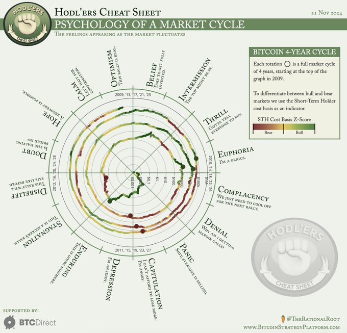 Title: Re: Estratégia de saída da Bull Run 2024/2025 + Bola de Cristal Post by: tg88 on December 09, 2024, 10:42:45 PM Só uma teoria minha, mas acho que muita gente ia vender nos 100k, até eu tinha uma meta de vender uma parte quando chegasse nos 95k Porém quando chegou, eu olhei para a nossa situação do real, dólar, economia, inflação, impostos etc, e pensei: vou trocar por que? Obviamente o BTC pode ter correções fortes, ciclos, pode ser desacreditado novamente, mas eu tenho um sentimento que será importante ter BTC ao longo da minha vida, então sigo com meu hold Hoje estava dando uma olhada os long term holders estão vendendo bastante nessa faixa dos 100k mas acho que já era esperado né, muita gente inclusive eu tinha sonhos e planos para realizar quando esse patamar fosse alcançado. Em contrapartida tem essa pressão de compra institucional que está dando um bom suporte para essas vendas, acho que dentro de alguns dias esse sentimento dos 100k se torne "novo normal" e ai a pressão de venda tende a diminuir. Title: Re: Estratégia de saída da Bull Run 2024/2025 + Bola de Cristal Post by: l3pox on December 10, 2024, 06:10:26 PM bom, se os ciclos de 4 anos continuarem sendo respeitados o topo estaria um pouco mais longe mesmo, vamos ver...