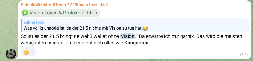 Quote The exact time of the merge is still open, we will keep you up to date as soon as it is ready. You will be informed several weeks in advance. Quelle (https://blog.bitpanda.com/en/introducing-vision-all-one-web3-token-unites-best-pantos) Die "several weeks" klingen jetzt nicht danach, dass das Ganze bald über die Bühne gehen wird. Eventuell wird Bitpanda trotzdem beim 21. bleiben und an diesem Tag einfach weitere Details und/oder einen Fahrplan veröffentlichen. Im verlinkten Blogpost stehen übrigens auch nochmal die Konversationsraten von BEST/PAN wer die noch nicht kannte. Title: Re: [Diskussion] Bitpanda Vision VSN Token Allgemeiner Diskussionsthread Post by: Real-Duke on May 12, 2025, 06:17:50 PM So. Heute haben wir den 12.05.2025 . Am 21.5.2025 sollte ja etwas passieren. Evtl. mit dem neuen Vision Token. Allerdings sollte dann 14 Tage vorher eine Info kommen bezüglich des Merge. Habe da heute mal mit meinem Arbeitskollegen drüber gesprochen, der auch einen Account bei Bitpanda hat. Er hat bisher noch überhaupt nichts davon mitbekommen, obwohl ich ihn auch immer mal an die Spotlights erinnere sobald ich davon erfahre ;) Sollten sie eventuell noch ein bisschen mehr Werbung für ihre Vision Token machen? Title: Re: [Diskussion] Bitpanda Vision VSN Token Allgemeiner Diskussionsthread Post by: Soonandwaite on May 12, 2025, 07:53:52 PM So. Heute haben wir den 12.05.2025 . Am 21.5.2025 sollte ja etwas passieren. Evtl. mit dem neuen Vision Token. Allerdings sollte dann 14 Tage vorher eine Info kommen bezüglich des Merge. Habe da heute mal mit meinem Arbeitskollegen drüber gesprochen, der auch einen Account bei Bitpanda hat. Er hat bisher noch überhaupt nichts davon mitbekommen, obwohl ich ihn auch immer mal an die Spotlights erinnere sobald ich davon erfahre ;) Sollten sie eventuell noch ein bisschen mehr Werbung für ihre Vision Token machen? Also wenn Bitpanda so viel Werbung für den Vision Token machen wie sie es bei dem Best Token gemacht haben dann gute Nacht. Denn wirkliche Werbung für den Best Token gab es doch nie. Selbst in der App waren kaum Hinweise zu sehen das man mit Best Vorteile hat/hatte. Ich lehne mich sogar so weit aus dem Fenster das Minimum 10 % der Bitpanda Kunden nicht einmal wissen das es Best gibt bzw. wozu der da ist ;D Title: Re: [Diskussion] Bitpanda Vision VSN Token Allgemeiner Diskussionsthread Post by: Koal-84 on May 12, 2025, 07:57:27 PM Also da ist BitPanda ein ganz eigenes Thema bezüglich Werbung, gibt es eigentlich irgendeine wirkliche Werbung für die Hauseigenen Tokens?