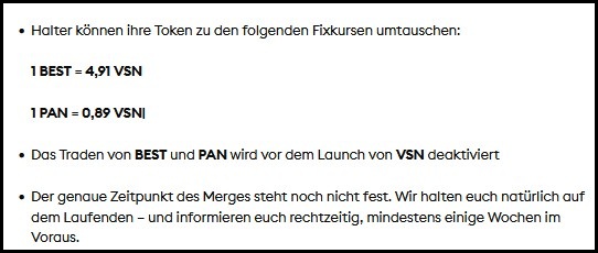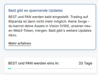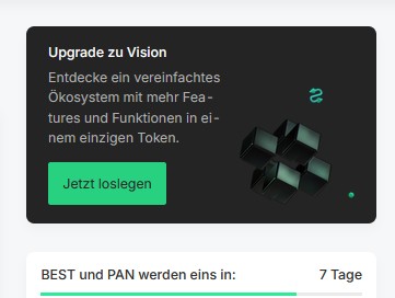 Nachdem ich mir dann alles in Ruhe angesehen habe,nachgelesen habe , in mir gegangen usw. habe ich durch diese extremen Kursschwankungen doch wieder mein Ursprünglichen Etat wieder. Am Ende der Fahnenstange dank den Kriesen dieser Welt sogar noch mit einem Plus. Jetzt noch die Rewards an Best mitnehmen und gut ist. Dann Daumendrücken das VSN gut beworben wird und die richtigen Exchanges kommen. Dann noch ein paar nette Usecases und ich bin zufrieden. Dann sollte es evtl. auch mit dem Plan damit Geld zu generieren weiter funktionieren. Wie lange gibt es eigentlich Best Rewards ? Bis zum Merge oder bis man den Antrag für den / das / die Merge stellt ? Glaube das sind 2 unterschiedeliche Termine Title: Re: [Diskussion] Bitpanda Vision VSN Token Allgemeiner Diskussionsthread Post by: Koal-84 on June 26, 2025, 10:00:18 AM Für mich wäre die Umwandlung in BTC also eher eine Flucht in ein "stabileres" Asset. Nicht nur in einen stabileren Asset, sondern die letzten Jahre (meine Registrierung 2017) auch eine wirkliche Wertanlage, keine Zockerei wie mit 99% der Altcoins. Wie lange gibt es eigentlich Best Rewards ? Bis zum Merge oder bis man den Antrag für den / das / die Merge stellt ? Glaube das sind 2 unterschiedeliche Termine Habe dazu auch noch nicht viel gelesen, außer das es Details erst kurz vor dem Launch geben soll, aber kommen soll etwas. Quote „Vision (VSN) wird als Gas-Token im gesamten Ökosystem fungieren und die Transaktionsgebühren innerhalb des Vision-Protokolls abdecken. Gleichzeitig entwickeln wir die von BEST bekannten Burn- und Rewards-Mechanismen weiter – angepasst an die Anforderungen der neuen Web3-Umgebung. Der Gesamtbestand von VSN ist auf 4,2 Milliarden Token festgelegt. Details zum Umlaufangebot werden kurz vor dem Launch veröffentlicht“, heißt es in einem Update seitens Bitpanda-CEO Eric Demuth. Bitpanda legt BEST- und Pantos-Token zusammen, User bekommen neue VSN (Update) (https://www.trendingtopics.eu/bitpanda-legt-best-und-pantos-token-zusammen-user-bekommen-neue-vsn-token/) Quote Konkret bekommen VSN-Nutzer:innen unter anderem 20 Prozent Gebührenersparnis auf bitpanda.com und in der Bitpanda DeFi Wallet und frühzeitigen Zugang zu Token-Projekten auf Bitpanda Launchpad. Vision (VSN): Bitpanda führt seine Token BEST und Pantos zusammen (https://brutkasten.com/artikel/vision-vsn-bitpanda-fuehrt-seine-token-best-und-pantos-zusammen) Quote Mit der Einführung des Tokens Vision (VSN) am 16. Juli beginne man den Aufbau eines eigenen Web3-Ökosystems, heißt es von Bitpanda. Kann man sich nur überraschen lassen. Title: Re: [Diskussion] Bitpanda Vision VSN Token Allgemeiner Diskussionsthread Post by: Soonandwaite on June 26, 2025, 11:09:47 AM Also wie ich es jetzt herauslesen konnte in einem der vielen Telegram Channels gibt es die letzten Best Rewards am 7 Juli 2025 . Danach ist Schluss.