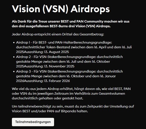 spekuliert. Aber genaues wusste man nicht. Somit ist diese Ankündigung doch schon mal ein wenig Trost. ;) Mal schauen was da noch mal bei rum kommt. https://i.postimg.cc/4xPcfpFy/airdrop-vision.jpg (https://postimages.org/) Quelle: https://www.bitpanda.com/de/web3/vsn-launch-incentive (https://www.bitpanda.com/de/web3/vsn-launch-incentive) Title: Re: [Diskussion] Bitpanda Vision VSN Token Allgemeiner Diskussionsthread Post by: Lakai01 on July 11, 2025, 05:42:31 AM Na ja. Dafür gibt es aber auch ein paar Airdrops. So sollen die PAN und BEST Halter nochmals extra belohnt werden. Es wurde ja schon paar Wochen lang Das ist tatsächlich ein netter Zug von Bitpanda, ja. spekuliert. Aber genaues wusste man nicht. Somit ist diese Ankündigung doch schon mal ein wenig Trost. ;) Mal schauen was da noch mal bei rum kommt. Ich hätte jetzt aber in dem von dir oben verlinkten PDF nichts mehr zu niedrigeren Levels gelesen. Fand die Einstufung nach den BEST-Levels eigentlich recht fair und für alle erreichbar. Wenn das jetzt nur noch nach Tradingvolumen geht und man das sogar über die Monate/Jahre hinweg halten muss um die Einstufung nicht zu verlieren ist das schon etwas ... anspruchsvoller. Title: Re: [Diskussion] Bitpanda Vision VSN Token Allgemeiner Diskussionsthread Post by: Koal-84 on July 11, 2025, 10:50:43 AM Wer bitte hat denn ein aktives Trading-Volumen von 50k pro 6 Monate? Und das noch dazu bei den doch sehr geschmalzenen Bitpanda-Gebühren? Das kann sich doch maximal an eine handvoll Leute richten? Die "Benefits" klingen jetzt auch nicht soo überragend (und noch recht schwammig) damit sich das dann auch tatsächlich lohnt. Da bin ich echt gespannt wie das Ganze angenommen wird! Das habe ich auch gelesen. Unter dem Silver-Programm gibt es aber nichts mehr. Die haben doch nicht mehr alle Tassen im Schrank. Wie soll man auf BitPanda einen Broker mit 50.000 Euro Tradingvolumen zusammenbekommen? So viele Vergütungen und Aktionen kann man gar nicht bekommen, um die Gebühren auszugleichen. Und das dann alle sechs Monate... Das ist tatsächlich ein netter Zug von Bitpanda, ja. Das ist tatsächlich ein netter Zug, ja. Title: Re: [Diskussion] Bitpanda Vision VSN Token Allgemeiner Diskussionsthread Post by: Soonandwaite on July 14, 2025, 08:08:27 PM Na Leute ! Was meint ihr welche Börsen am 16 dabei sind ?