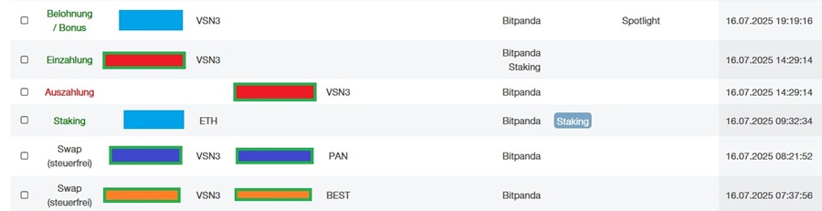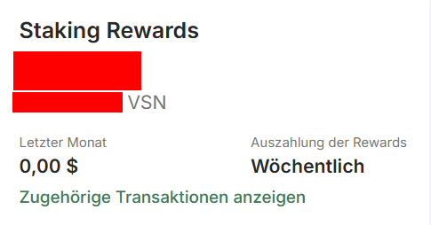Die Mail dazu kommt aber wohl erst morgen im Laufe des Tages. Viel Spaß beim Luschern ;D Title: Re: [Diskussion] Bitpanda Vision VSN Token Allgemeiner Diskussionsthread Post by: Lakai01 on July 23, 2025, 03:43:01 AM Wer es wissen will muss sich einloggen und dann nachschauen ................ die ersten VSN Rewards sind zu sehen. Tatsächlich, danke für den Hinweis! Bitpanda staked die auch sofort wieder, man nutzt hier also auch gleich den "Zinseszinseffekt" aus und braucht sich eigentlich um nichts weiter zu kümmern.Die Mail dazu kommt aber wohl erst morgen im Laufe des Tages. Viel Spaß beim Luschern ;D Es sei denn, man nutzt Cointracking: Leider funktioniert ja bei Bitpanda der automatische Abgleich der Rewards in Cointracking noch immer nicht, auch diese Rewards muss man dann leider wöchentlich händisch hinzufügen. Title: Re: [Diskussion] Bitpanda Vision VSN Token Allgemeiner Diskussionsthread Post by: Real-Duke on July 23, 2025, 08:13:01 AM Wer es wissen will muss sich einloggen und dann nachschauen ................ die ersten VSN Rewards sind zu sehen. Ja endlich geht es los ;D Gerade in der App nachgesehen: Nüscht! Danach auf der Webseite eingeloggt und: Ahhhhh 8) Also vor ein paar Jahren (einige unter euch erinnern sich vielleicht noch daran) hätte ich von meinen Zinsen locker ein 8 Minuten Ortsgespräch führen können :D Title: Re: [Diskussion] Bitpanda Vision VSN Token Allgemeiner Diskussionsthread Post by: Koal-84 on July 23, 2025, 09:46:11 AM Ich habe die Zinsen gut geschrieben bekommen, also es ist ein Unterschied da, von den VSN die ich ins staking gegeben habe und zur aktuellen Anzahl der VSN Tokens im staking, finde dazu aber wenn man bei Vison auf zugehörige Transaktionen geht, nichts dazu?