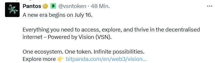 PANTOS hat heute folgendes angekündigt: https://i.postimg.cc/G3Y4RJdF/screenshot-801.png (https://postimages.org/) Quelle (https://x.com/vsntoken/status/1933096340806066367) Am 16. Juli geht es also jetzt offiziell los, Bitpanda hat damit also "Q2" nur ganz knapp verfehlt. Bin gespannt, ob sich diese Ankündigung jetzt auf entweder den Kurs von PAN oder von BEST doch noch positiv auswirkt. Hier auch noch ein Countdown bis es losgeht: https://www.bitpanda.com/en/web3/vision-token Title: Re: [Diskussion] Bitpanda Vision VSN Token Allgemeiner Diskussionsthread Post by: MinoRaiola on June 12, 2025, 03:33:16 PM Bin gespannt, ob sich diese Ankündigung jetzt auf entweder den Kurs von PAN oder von BEST doch noch positiv auswirkt. Vorab Danke für die Information. Der Kurs von BEST ist heute um +17% gestiegen, es hat kurzfristig also schon eine Auswirkung.Innerhalb der bitpanda App stehen auch schon ein paar Infos. Der 16 Juli ist wohl fix mit dem Release, danach gibt es noch ein paar Meilensteine. Ab August 25 das Vision Protocol, Launchpad in Q4 2025 und Vision Chain "2026". Also ein großer Fahrplan für XXX. Es kommt also Bewegung rein, bin gespannt was die kommenden 30 Tage passiert mit dem Kurs. Title: Re: [Diskussion] Bitpanda Vision VSN Token Allgemeiner Diskussionsthread Post by: Soonandwaite on June 13, 2025, 01:50:43 PM Puuuh. Habe ich jetzt Glück oder Pech gehabt das ich PAN und Best noch weitaus günstiger bekommen habe die Tage.
