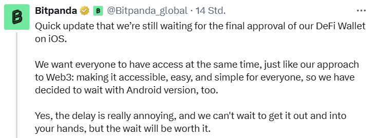 Title: Re: [Diskussion] Bitpanda Vision VSN Token Allgemeiner Diskussionsthread Post by: Lakai01 on May 20, 2025, 11:12:21 AM Die Web3.0-App wird sich verzögern