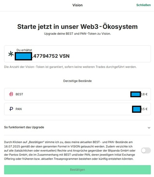 und dann folgt dieser Hinweis siehe BIld: https://i.postimg.cc/pLS34r3W/vision1.jpg (https://postimages.org/) Quelle: Bitpanda und anschließend sollte die Menge der Vision Token kommen. Wer Best und PAN hat wird beides zusammengerechnet. Das sieht dann so aus : https://i.postimg.cc/qMSLdKB5/Vision.jpg (https://postimages.org/) Quelle:Bitpanda Manche schreiben in Telegram sie haben zu viel oder zu wenig VSN ! Ich habe es noch nicht berechnet. Werde mir das man die nächsten Tage ansehen. Viel Spaß mit VISION = VSN Title: Re: [Diskussion] Bitpanda Vision VSN Token Allgemeiner Diskussionsthread Post by: Lakai01 on July 09, 2025, 12:57:35 PM Dannke für den Hinweis, habe mich auch gleich mal eingelogged und das Upgrade durchgeführt ... also ... zugestimmt, dass das Upgrade gemacht werden darf.