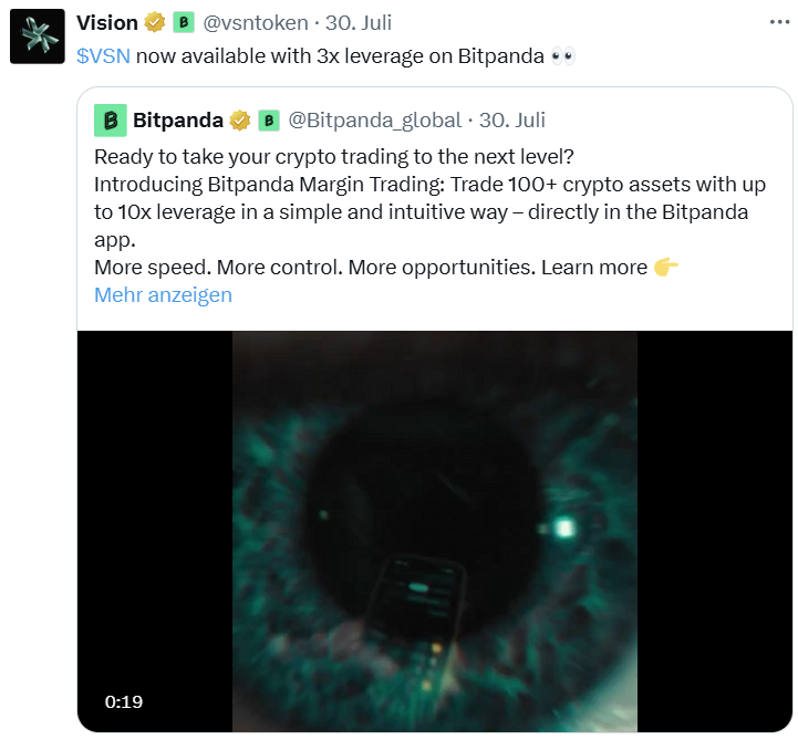 Nun ist es aber wohl offiziell: Vision wird auf Kraken gelistet. Das hat Kraken mit dem Post jetzt wohl selbst bestätigt. Somit wird es immer interessanter für uns Hodler. Hier zum nachlesen: https://x.com/krakenfx/status/1941090261347553417 (https://x.com/krakenfx/status/1941090261347553417) Title: Re: [Diskussion] Bitpanda Vision VSN Token Allgemeiner Diskussionsthread Post by: MinoRaiola on July 04, 2025, 01:56:06 PM Ich glaube wir haben darüber schon mal diskutiert. Aber wir wollten es mit dem Listing ja nicht so recht glauben. Das habe ich eben auch gerade gesehen und es wäre im Vergleich zu BEST und PAN ein Fortschritt. Die Angebotsvielfalt steigt und das Volumen ebenfalls. Ich habe mich ein wenig gewundert, warum der Kurs in den letzten 7 Tagen (ca. +20%) stetig ansteigt, das ist/war dann ggfs. der Grund dafür. Vielleicht kommen ja noch ein paar andere Börsen dazu. Dann wird VSN in Zukunft bestimmt auch bei den gesponserten Teams zu sehen sein. Also etwas PR zu Beginn sollten sie schon eingeplant haben.Nun ist es aber wohl offiziell: Vision wird auf Kraken gelistet. Das hat Kraken mit dem Post jetzt wohl selbst bestätigt. Somit wird es immer interessanter für uns Hodler. Hier zum nachlesen: https://x.com/krakenfx/status/1941090261347553417 (https://x.com/krakenfx/status/1941090261347553417) Title: Re: [Diskussion] Bitpanda Vision VSN Token Allgemeiner Diskussionsthread Post by: Koal-84 on July 04, 2025, 06:08:00 PM Ich bin jetzt aber überrascht, Best und Pan hat es ja fast nirgends hin geschafft, und ein Token der noch nicht mal veröffentlicht ist gleich auf Kraken, da hat BitPanda anscheinend einmal etwas in die Tasche gegriffen. Wird es auf Bitfinex statt dem Best Token auch weiterhin VSN geben?