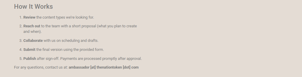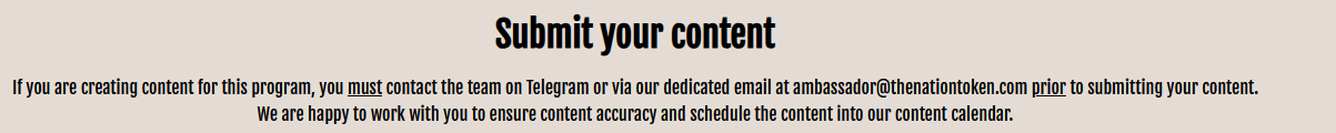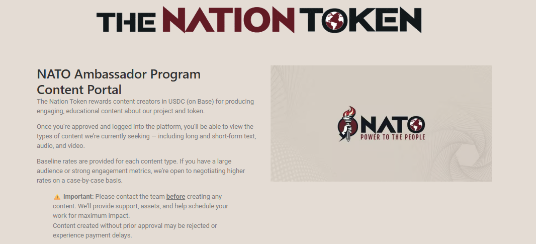 Title: $NATO Bounty Ambassador Program (Twitter, Telegram, Discord, Youtubers, etc) Post by: jatin729 on August 20, 2025, 11:01:30 AM https://i.postimg.cc/tJt6NS0R/image.png (https://thenationtoken.com/) https://i.postimg.cc/T1p8rS5g/image.png (https://thenationtoken.com/join-the-nato-ambassador-program) https://i.postimg.cc/q7SDPRNh/image.png (https://thenationtoken.com/join-the-nato-ambassador-program) https://i.postimg.cc/d3q2pPjZ/image.png (https://thenationtoken.com/join-the-nato-ambassador-program) https://i.postimg.cc/pTkh99Ky/image.png (https://thenationtoken.com/join-the-nato-ambassador-program) https://i.postimg.cc/Z5k8zdHh/image.png (https://drive.google.com/drive/folders/12e_oWkjCYqJosOAyb2JQ0bLYnVLA3gr7) https://i.postimg.cc/GpLX85fQ/image.png (https://thenationtoken.com/) Steps Step 1: Submit your Application Ambassdor Form - Click Here (https://thenationtoken.com/join-the-nato-ambassador-program) Step 2: Await Application Review Your submission will be reviewed by the NATO team against program criteria (e.g. fit based on your social and details). You will receive an email with possible outcome whether you are selected / rejected for this program. You will receive an Email from ambassador@thenationtoken.com Step 3: If Approved Complete Onboarding You will get a access to the content portal. Our team will provide you the password for this portal (https://thenationtoken.com/join-the-nato-ambassador-program/ambassador-program-content-portal/) Step 4: Review Guidelines and Plan Content Always confirm your content ideas with team before production to ensure alignment with scheduling, budget and support. Skipping this may lead to rejection and delay in payment Step 5: Produce and Submit content Once content approved by team, submit the content on portal with link to social Step 6: Await content review and Payment Team will review the submission for accuracy and compliance and tone. Payment are processed weekly for eligible content. If you are creating content for this program, you must contact the team on Telegram or via our dedicated email at ambassador@thenationtoken.com prior to submitting your content. We are happy to work with you to ensure content accuracy and schedule the content into our content calendar. |
