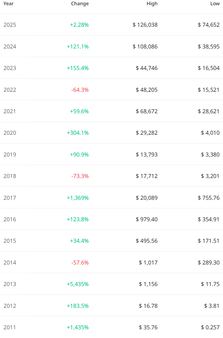 Using https://dcabtc.com/ I see that, according to what's happened the last 8 years, if you had invested $100 monthly you would have $40,000 today. So good but not life changing money. Title: Re: Could Bitcoin change my life, or will it mainly change when I reach middle age? Post by: BIT-BENDER on November 16, 2025, 02:49:19 PM I’m in my early 30s and have around $2,000 saved in Bitcoin. I first heard about crypto and Bitcoin a few years ago, and of course I made the “classic beginner mistakes”: I joined flashy MLM-style projects that eventually collapsed and lost some money. The only thing I managed to avoid was the memecoins hype. You may likely fall for another MLM project scam and it is not a classic beginners mistake, there are beginners who did not fall victim of that and there are people who have had years in Bitcoin but still fall for such.The big reason why people fall for that scheme and other scam is greed, uncertainty and quick wealth. From your questions you want to be sure that Bitcoin will change your financial situation and also you are not sure about how quick that will be and you are worried it may be in your mid ages or probably something your kids will benefit, all these thoughts and uncertainty may lead you in making unsettled decision that can be land you in trouble. Don't just wait on Bitcoin you can enhance yourself, learn more skills do more things that can increase you source of income, save in Bitcoin as much as your financial ability can carry and don't worry too much. Title: Re: Could Bitcoin change my life, or will it mainly change when I reach middle age? Post by: SilverCryptoBullet on November 16, 2025, 02:55:27 PM To be honest, part of me hoped that crypto or Bitcoin could eventually be the kind of investment that might whether gradually or suddenly, give me a significant step forward in life someday. Something like being able to afford a stable home where I could safely start a family, or make a major life improvement. First, if you have yet known and read this book, it is time for you to read it.The bullish case for Bitcoin. (https://vijayboyapati.medium.com/the-bullish-case-for-bitcoin-6ecc8bdecc1) After reading the book, please look at the yearly chart. https://www.coinglass.com/pro/i/yearly-candlestick-chart If you need more details on Bitcoin ROIs over past years. https://cryptorank.io/price/bitcoin/analytics Quote But one question keeps coming back to me recently: what if my current circumstances simply aren’t enough for that?[/b Now it's time for you to work, get money, prepare your investment capital and do DCA bitcoin with time.Title: Re: Could Bitcoin change my life, or will it mainly change when I reach middle age? Post by: Son Of Blockchain (SOB) on November 16, 2025, 02:58:43 PM Saving $2k in Bitcoin is not a bad idea and depending on how long you can hodl it, there's a great possibility that your 2k can change your life being stored in Bitcoin overtime, that's a fact that's proven and early holders of the coin can testify to that well too bad I can't relate with most of them since I didn't get into Bitcoin earlier but history has proven that to me.