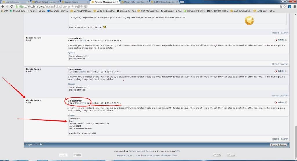 I transferred 0,05 BTC in February. I've posted the TrxID, but my comment has been removed. Now I did pay, but my name is not on the registration list. I've send al members of NEM a message, but didn't get a reply yet. Please assist. Hereby again the TrxID: BitCoin 1Lk5Paws9T1YpoSeLeZT7ZeSQKW7UNq4TJ 0.05000000 BTC Yes 2014-02-04 12:50:00 Processed TrxID: 1825344c38cdadee19939ffc402cd8947f068112e66e3dc5f7d709c93d69b5ab @ 2014-02-05 05:22:13 Kind regards, Latifa Chalgoum Title: Re: NEM - New Economy Movement - Refund/Account Change Requests & Complaints Post by: patmast3r on July 12, 2014, 03:41:49 PM Hi there, I transferred 0,05 BTC in February. I've posted the TrxID, but my comment has been removed. Now I did pay, but my name is not on the registration list. I've send al members of NEM a message, but didn't get a reply yet. Please assist. Hereby again the TrxID: BitCoin 1Lk5Paws9T1YpoSeLeZT7ZeSQKW7UNq4TJ 0.05000000 BTC Yes 2014-02-04 12:50:00 Processed TrxID: 1825344c38cdadee19939ffc402cd8947f068112e66e3dc5f7d709c93d69b5ab @ 2014-02-05 05:22:13 Kind regards, Latifa Chalgoum You should have gotten a pm saying your post was removed with a quote of the removed message. Plz make a screenshot of that pm and post it here. Title: Re: NEM - New Economy Movement - Refund/Account Change Requests & Complaints Post by: Latifa78 on July 15, 2014, 02:28:52 AM Hi there, I transferred 0,05 BTC in February. I've posted the TrxID, but my comment has been removed. Now I did pay, but my name is not on the registration list. I've send al members of NEM a message, but didn't get a reply yet. Please assist. Hereby again the TrxID: BitCoin 1Lk5Paws9T1YpoSeLeZT7ZeSQKW7UNq4TJ 0.05000000 BTC Yes 2014-02-04 12:50:00 Processed TrxID: 1825344c38cdadee19939ffc402cd8947f068112e66e3dc5f7d709c93d69b5ab @ 2014-02-05 05:22:13 Kind regards, Latifa Chalgoum You should have gotten a pm saying your post was removed with a quote of the removed message. Plz make a screenshot of that pm and post it here. http://i59.tinypic.com/snp3cp.png link: http://i59.tinypic.com/snp3cp.png Here's the image, thanks in advance Title: Re: NEM - New Economy Movement - Refund/Account Change Requests & Complaints Post by: patmast3r on July 15, 2014, 06:01:11 AM http://i59.tinypic.com/snp3cp.png link: http://i59.tinypic.com/snp3cp.png Here's the image, thanks in advance Yeah...this isn't going to cut it anymore. I need a fullscreen screenshot in high quality. Title: Re: NEM - New Economy Movement - Refund/Account Change Requests & Complaints Post by: Latifa78 on July 21, 2014, 01:47:04 AM Hereby again: